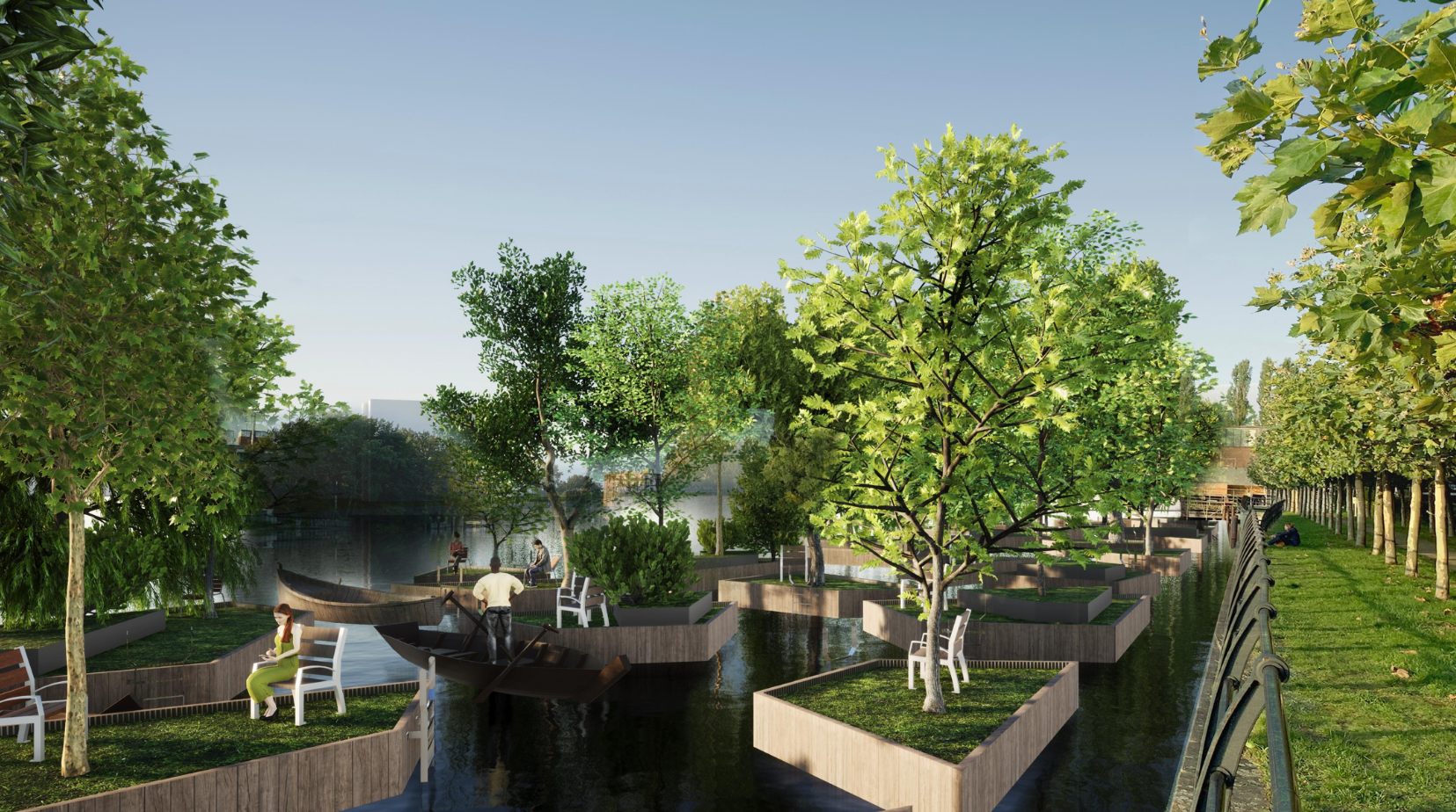 The Spreekreuz Inselpark aims to recover Shorelines for social interaction in a sustainable and green environment. For this, 45 floating Platforms will use the river water as a basis for the growth of plants and trees in order create a habitat for insects, birds and animals. It will also give people a unique surrounding for communication and relaxation and reintroduce biodiversity to a dwindling ecosystem.