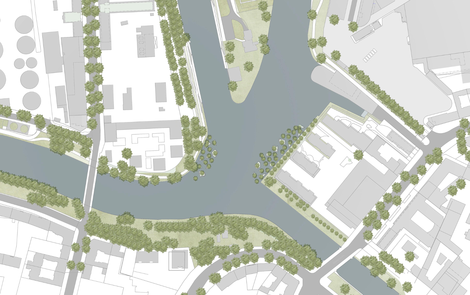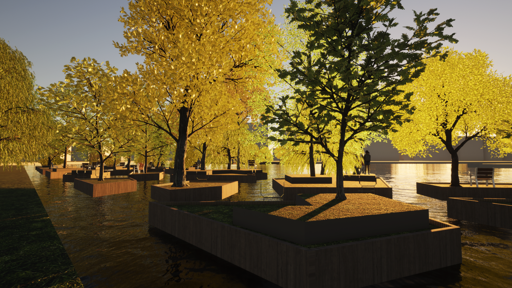 SKIP revitalises an otherwise bleak and boring part of the spree, where shorelines are built out of bulkhead walls and the water is otherwise not accessible. The reintroduction of nature into industrialised shorelines and the softening of waterfronts is what gives the project a unique beauty inside the context of a city surrounding without being overwhelming or pushy. It will look like a Forest that has grown from the river. Leaves will catch the light and the wind as the current of the Spree slowly pushes water past. The Design of the islands is minimalistic to emphasize the nature taking back its place in the city.