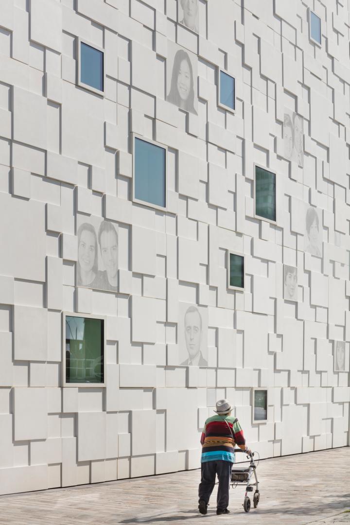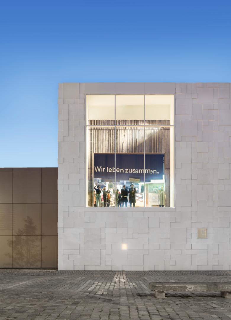 The second structural extension now presents the German Emigration Center as an ensemble of migration history in Germany. The part of the building opened in 2005 is dedicated to over 300 years of European emigration history. A bridge building now connects it with the new building. The sustainability concept for the extension is to preserve a smaller first extension from 2012 and integrate it into the new construction. This includes the old façade, which remains visible as a design element inside the new building. What is also sustainable is that the museum elevates stories and objects of migration to a cultural heritage. With the expanded collection and presentation, immigration history thus becomes part of German history. Aesthetically, the new building sets a monument to people who immigrated to Germany. A white cube with a complex layering of cassette-like concrete segments with portraits engraved into them is emblematic of the diversity of society in Germany. They are images of immigrant women, men, and children, sometimes more, sometimes less visible, depending on the incidence of light and the angle of view. They underline: Immigrants and their families belong to Germany and its history. A large “city window” provides an insight into the exhibition: "We live together" can be read there and sums up the museum's program. It is about togetherness in a modern immigration society that includes everyone. Inclusion plays a major role in the museum on other levels as well. The exhibition is barrier-free, multi-sensory, participatory and communicative. The German Emigration Center invites and supports the development of new perspectives. It encourages people to help shape coexistence in the country of immigration. Appreciation, participation, sharing and dialogue are components of the museum that create belonging.