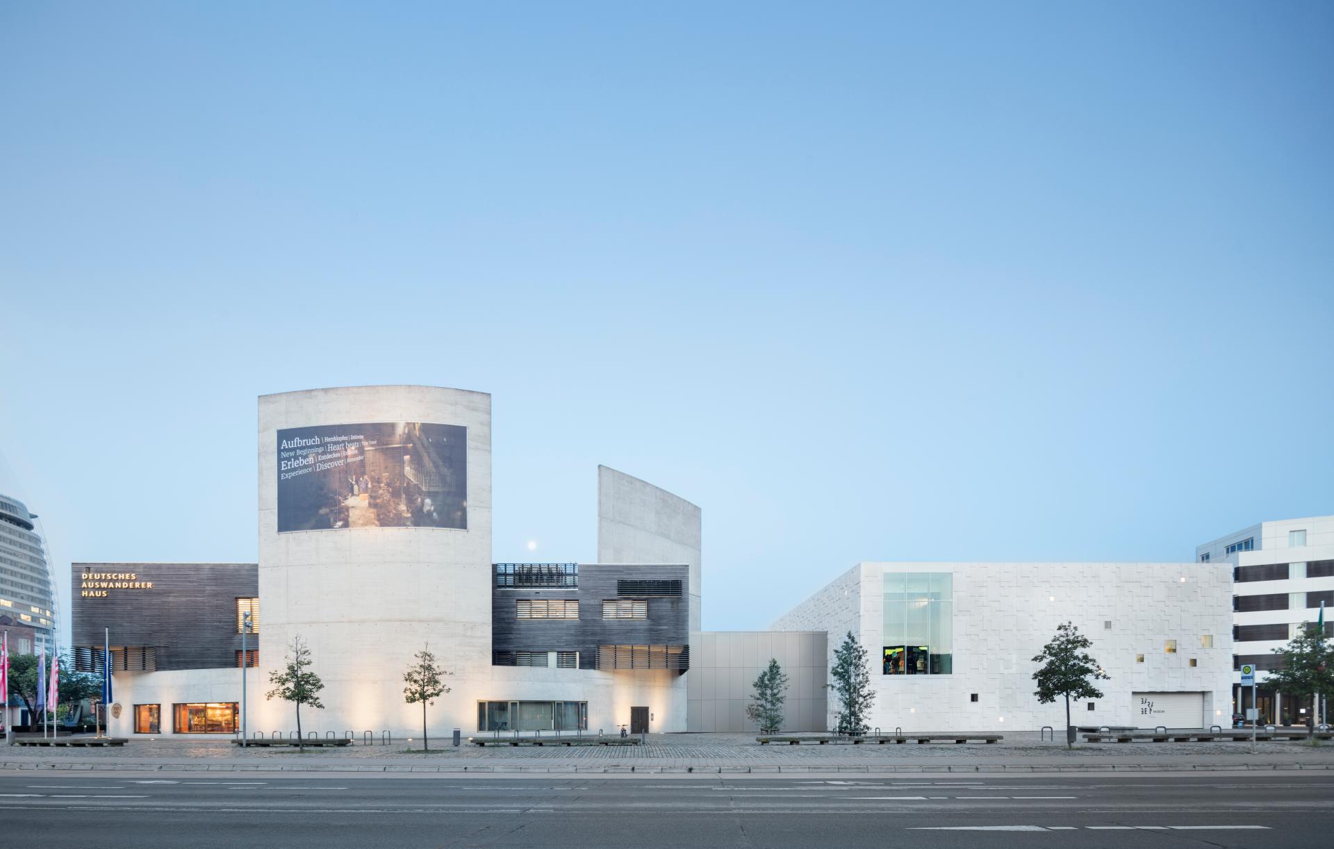 With the new extension, a museum ensemble was realized that stands for both sides of migration. The architectural language of the buildings is derived from the contents of the museum. Thus, the existing building with its towering concrete wings carries the spirit of departure of emigration and the complex appearance of the new building with its layering of cassette-like concrete segments is a symbol of the diversity of society in Germany. The new extension building also gives immigration a face: relief-like portraits of immigrants are engraved in precast concrete elements. Depending on the incidence of light and the angle of view, they sometimes stand out more, sometimes less. The building opens up into the urban space with generous gestures. A "garage museum" offers passers-by free, constantly changing exhibitions, a large glass façade element provides a glimpse into the permanent exhibition, and large bands of windows allow insight into the scientific work of the educational and research institution "ACOMIS". The exhibition continues the experience quality of the existing building. Stagings in large room collages convey history on different levels. Museum technology supports the experience and stimulates communication. The German Emigration Center is the first museum in Europe to address both sides of migration. With a strong, architectural gesture, it underscores the relevance of the topic of immigration. With its architecture, the museum sets a lasting sign of global and universal migration phenomena. The feeling of belonging should and must be self-evident and normal in an immigration society - the German Emigration Center has set itself the goal of conveying this feeling.
