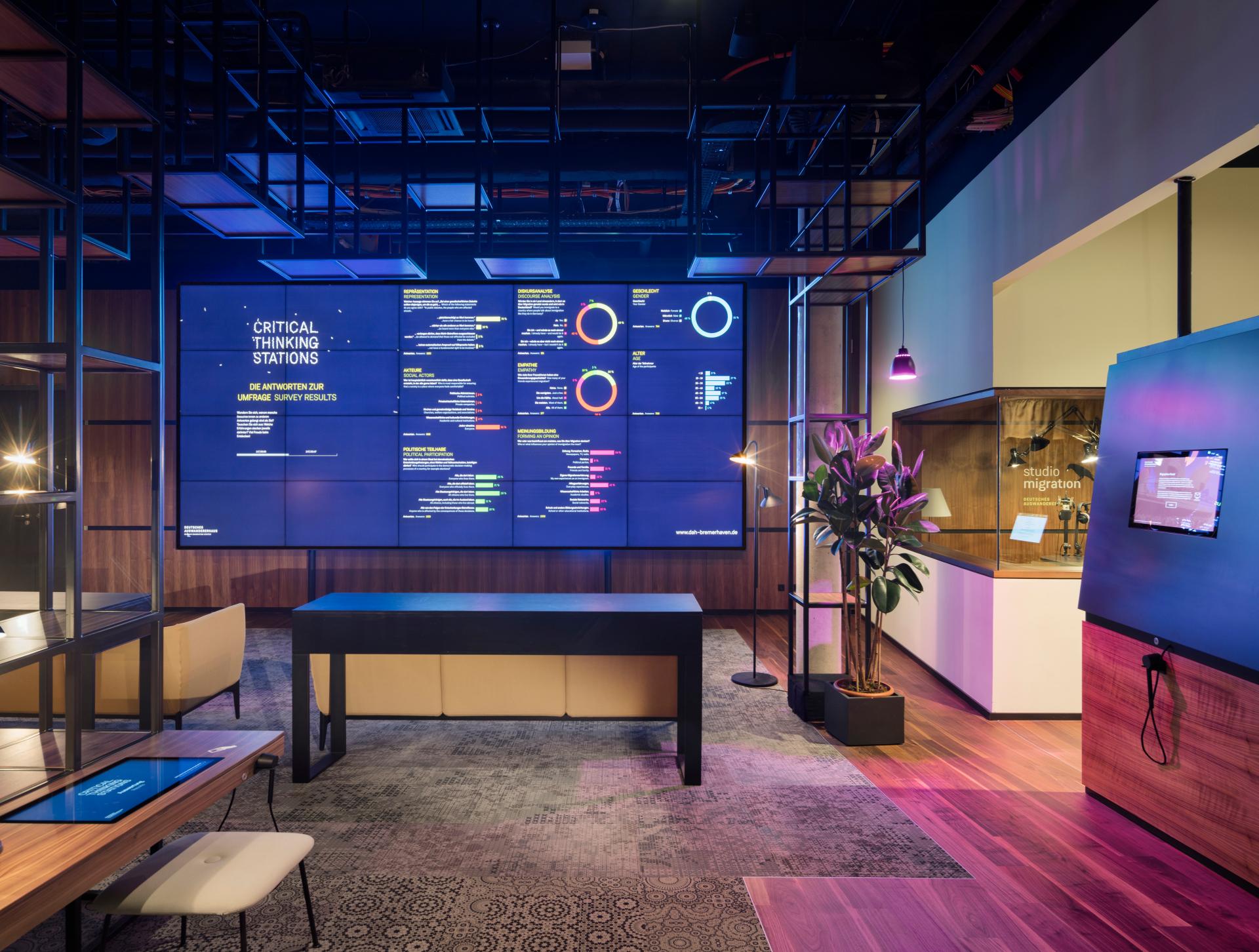 Bremerhaven was once one of the largest emigration ports in Europe. Today, the German Emigration Center is located at one of the former port facilities. It is therefore also an identity-forming institution for the city and the region. Today, Bremerhaven, like many other cities, is also characterized by immigration. The new extension also takes this trend into account and develops the city's identity as a place of diversity and togetherness in a modern immigration society. With the museum ensemble, a place of remembrance of departure has been transformed into a place of arrival and exchange. The museum focuses on participation and dialogue, which are created, among other things, through analog immersion - stagings in the form of spatial collages with spatial sound expand the imagination. The telling of stories by real people reinforces this aspect and enables empathy and identification. In the Hall of Debates, it is conveyed that dialogue is a fundamental principle of democratic processes. Historical debates can be examined from different perspectives. Guests' opinions are encouraged in the museum. Answers given at exhibition-accompanying "Critical Thinking Stations" are incorporated into a museum survey, which is statistically processed and presented at the end of the exhibition tour. One's own view can be reflected and compared with that of others. The conception understands people and their experiences not only as a part, but as the center of history and its conveyance. Collecting, preserving and presenting everyday stories creates a strong bond between the individual and the museum as a place of appreciation. One finds out that behind every migration experience there are human destinies. The newly founded Academy for Comparative Migration Studies (ACOMIS) in the new building is a research institution and an educational institute. It conveys a sense of belonging through the learning processes of an actively formative relationship to historical and social processes