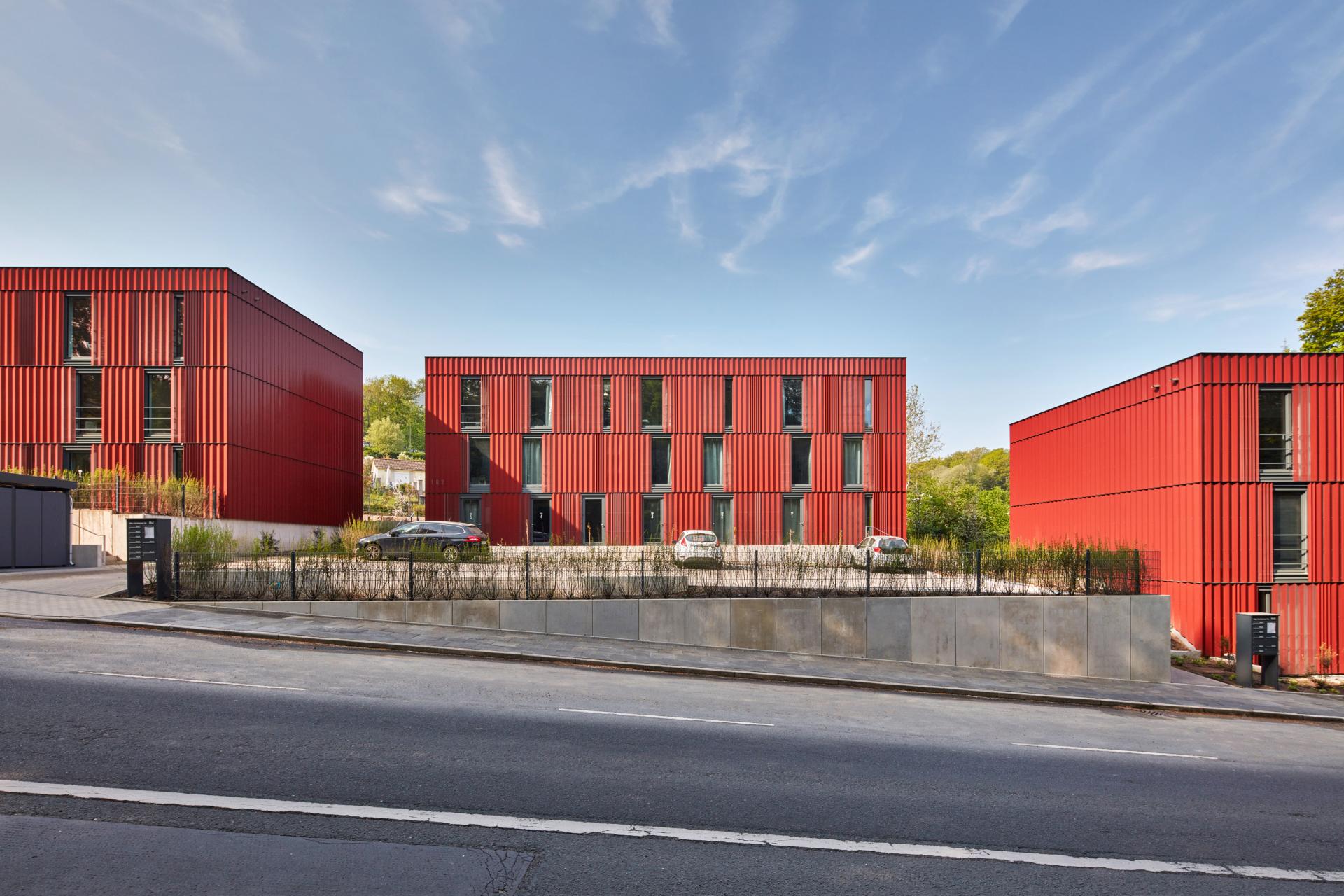 “The narrow residual plot with a height difference of 18 meters was long considered impossible to develop. The plot’s narrow layout is compensated by boundary-crossing design. The plants on the adjacent allotment garden area spill into the outdoor areas of the dormitory between the buildings. The hillside location was cleverly used to accommodate traffic and common areas at different heights. The façades are covered in profiled and partly perforated metal panels in red and silver, laid over the basic structure like a curtain that is opened in different ways to balance openness and discretion while creating a differentiated building type design. The ensemble draws attention without clamouring for it, while creating high-quality living space at the same time.”