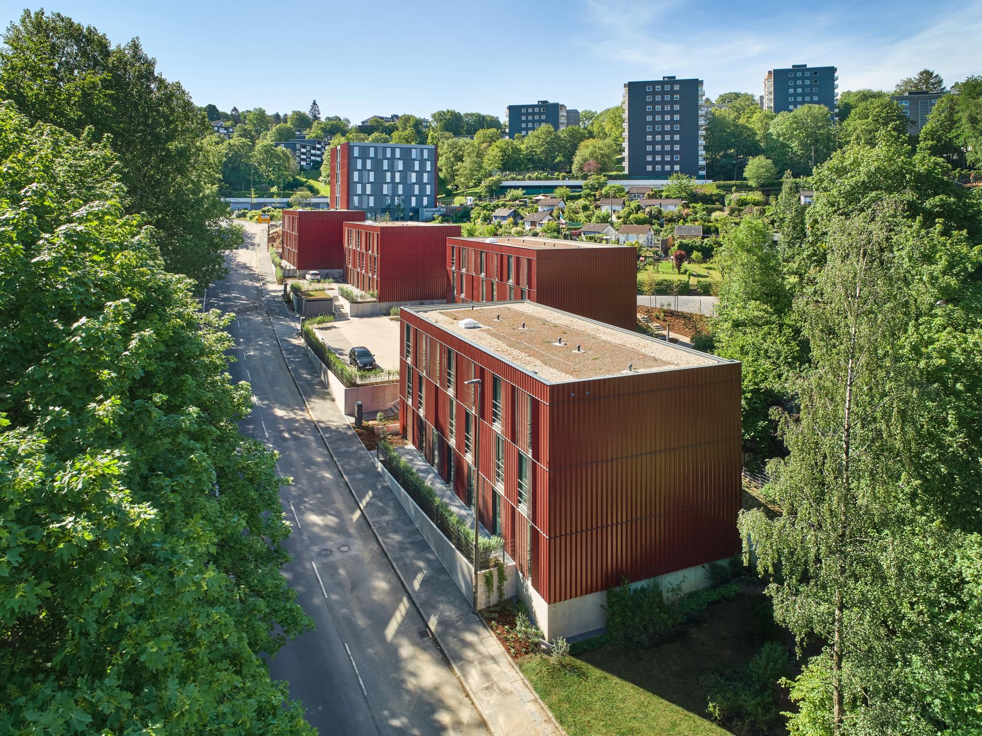 A residual plot was used to provide 132 residential units in the immediate vicinity of the University of Wuppertal. The location was deemed impossible to develop for a long time due to its very narrow layout and extreme slope. The passive-house standard was able to reduce power consumption to 40% of the EnEV requirements. The building method using a high proportion of wood ensures CO2 savings of more than 200 tons. The façade can be mostly dismantled sorted by type to be reused.