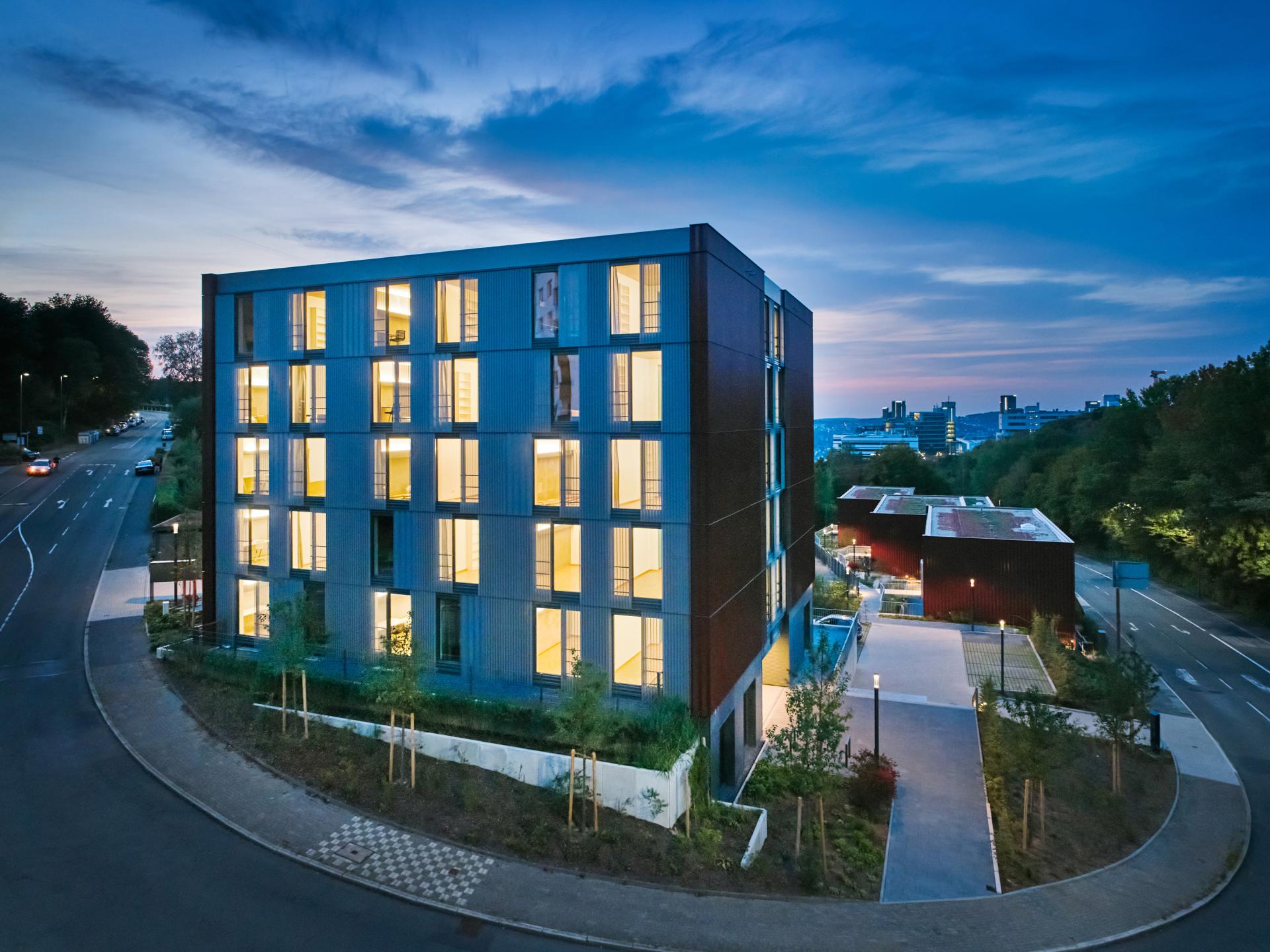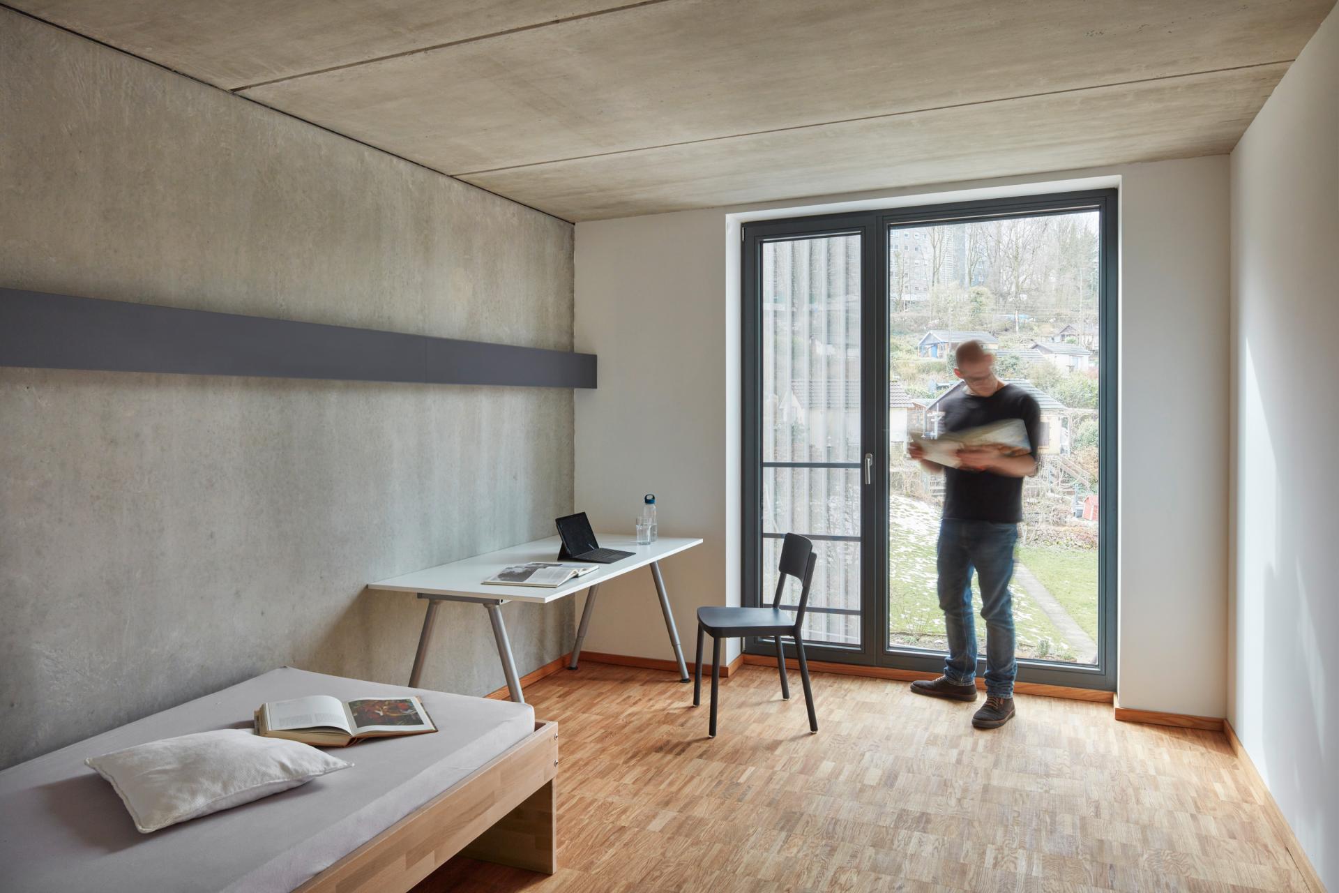 A residual plot was used to provide 132 residential units in the immediate vicinity of the University of Wuppertal. The location was deemed impossible to develop for a long time due to its very narrow layout and extreme slope. The design transforms this specific situation into an asset by using the slope to provide access to the houses on different levels and minimise the traffic areas built. The plot’s narrow layout is compensated by boundary-crossing design. The plants on the adjacent allotment garden area spill into the outdoor areas of the dormitory between the buildings. The existing university infrastructure with public transport, parking garages, gastronomy, data centre, and a connection to district heating will be used. A modular system that realises high-quality, affordable housing on reduced footprints was developed within the scope of a BBSR research programme. Individual rooms are connected by various common areas, from single apartments to apartments shared by as many as six. The passive-house standard was able to reduce power consumption to 40% of the EnEV requirements. The building method using a high proportion of wood ensures CO2 savings of more than 200 tons. The façade can be mostly dismantled sorted by type to be reused. The living space of 30 m² per person is 40% below the national average. e-mobility, car sharing, and public transport have reduced parking space requirements to 20%.