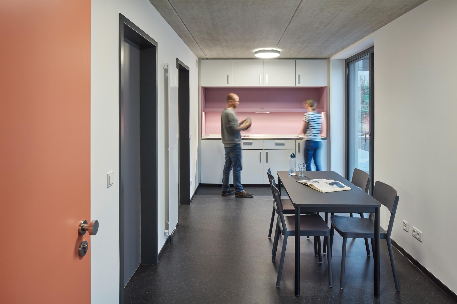 An essential factor of success for such small spaces is maximising acceptance. This is made possible mainly through high-quality design, but also through high interior variability and various possible uses. Partial furnishing in great design and quality provides space for personal development and a personal touch. The colour scheme is identity-forming without being obtrusive.