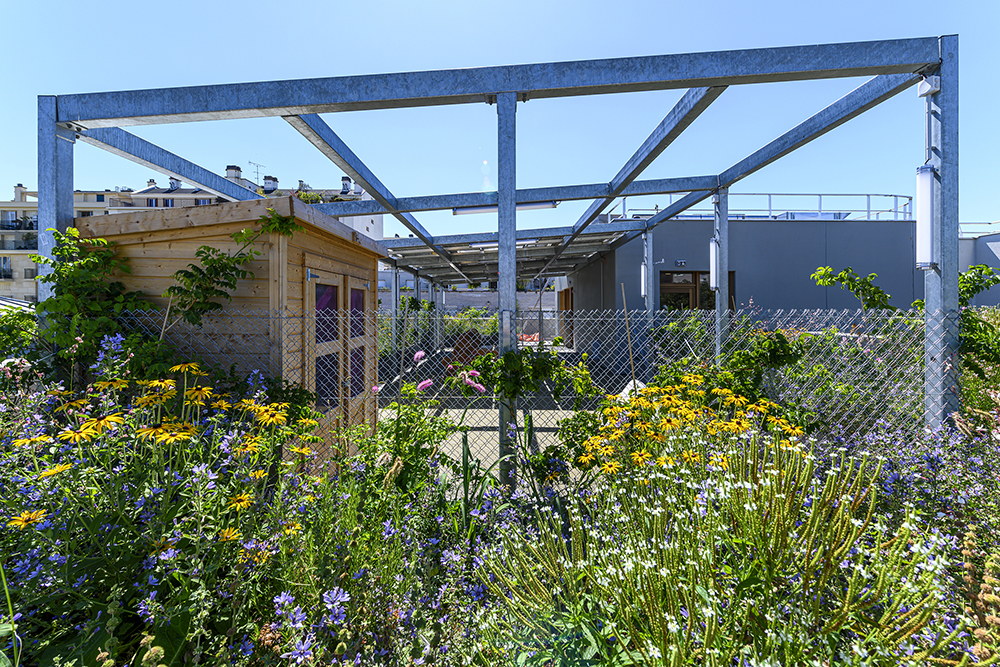 Wood is expressed in its natural materiality and contributes greatly to the soft and light atmosphere of the interior spaces. The top level is dedicated to a roof garden, thanks to the installation of 80cm deep planters. A pergola, supporting the solar panels, creates a protected outdoor play area for the children.