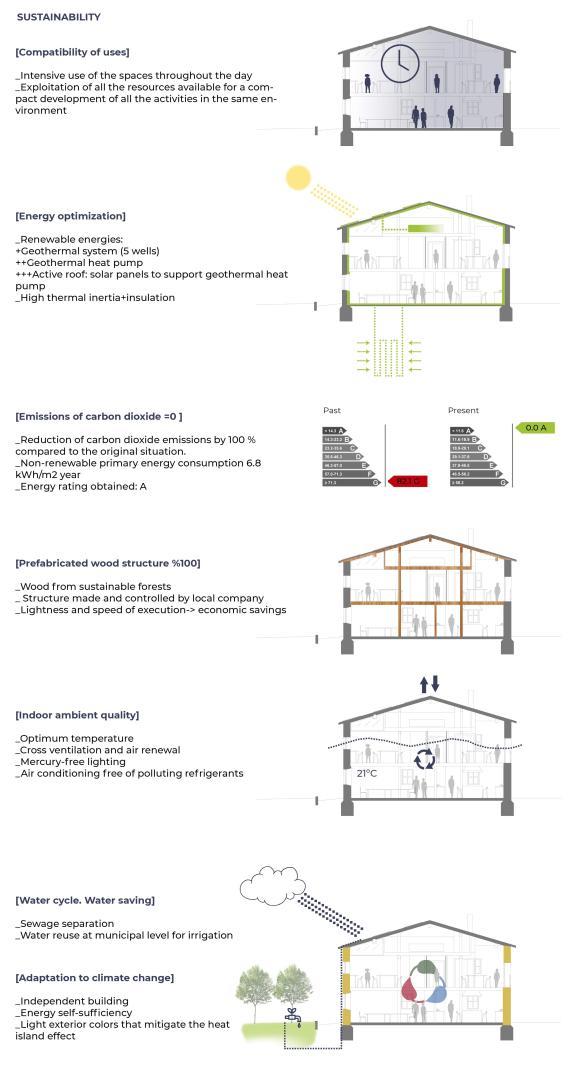 We had to take advantage of the resources in place, the same way traditional farmhouses used to do. That is why, the whole building works only with solar and geotermal power for the cooling and heating systems as well as to create all the electric power, needed by users.