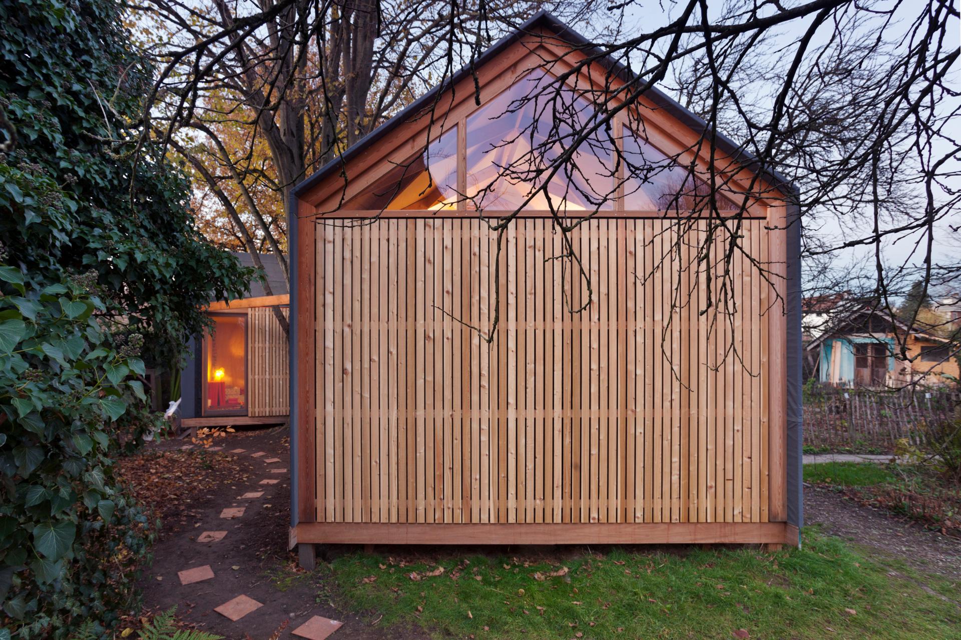 - With its reversible nature, modest size, natural materiality and integration within the vegetation, this structure reads very much as part the garden – a landscape feature. Its footprint and impact on the soil are close to zero. Is this house even a building?