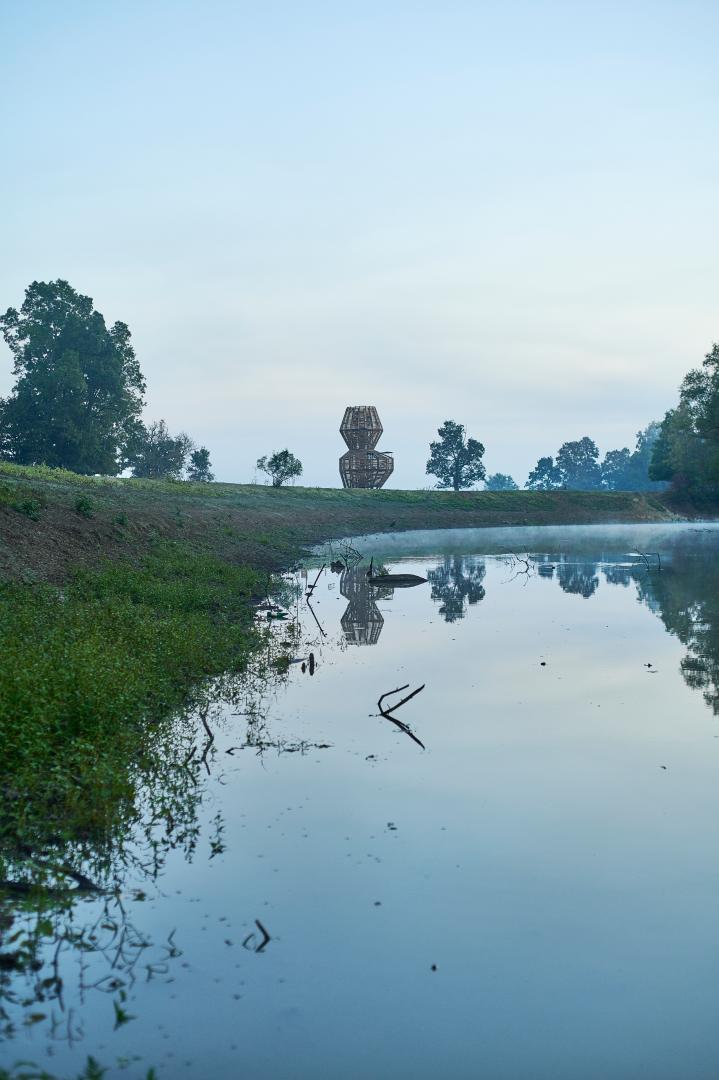 The observatories are a ludic element of the landscape, a new species which connotes various species and forms. Their biomorphic shapes are not explicit, yet embody movement, organic form, traditional tools, echoing the locally familiar. In their own dialogue, free from direct references, they speak a unique language: from afar they seem like a part of the landscape, mythologized local beings, frozen in their movement. In a non-hierarchical environment these new points provide a fleeting identity, become gravitational sources, attractors and measuring devices, peeking out in the distance as a new bestiarium.