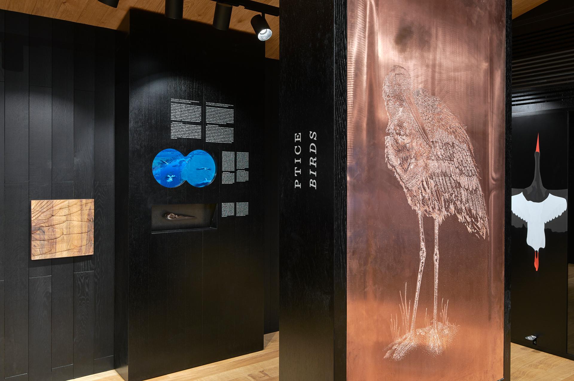 Six topics presented presented in the exhibition are: flood ecosystem, habitats and flora, fauna, birds, native breeds, and the cultural heritage of Lonjsko polje. As a starting point for the interpretation of all other topics, the first topic was interpreted in the Info-Center building - flood ecosystem - which due to its complexity and layering in the presentation of information is presented in the reception building in the form of an interactive table. The other five topics were presented in detail in the gallery space of the exhibition pavilion. The content of each thematic unit is presented through a combination of mechanical and multimedia exhibits with the author's illustrations, reliefs, and copper engravings. The air space inside each building that connects the ground floor and the gallery is filled with wood sculptural installations that connote flocks of different species of birds and fish that inhabit this area. The educational park in the exterior of the visitor center has the function of a polygon for play and rest with mechanical interactive spatial installations that interpret the voice of the stork, the family nest, and the function of the loggia. The observatories connote beings and tools which are locally familiar but never explicit. Inside, they present illustrations and descriptions of the many species which can be spotted from within.