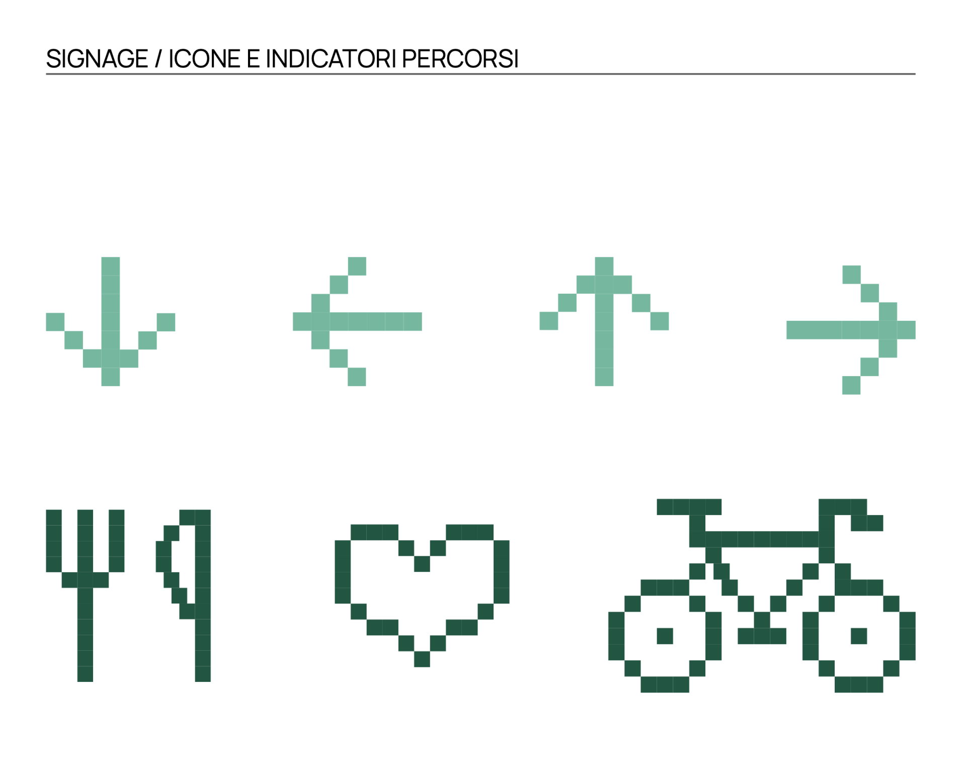 Stationarity and movement represent a dualism, reflected in the oxymoron of the brand identity: on one hand the static and cold aesthetics of the railway track; on the other the vitality of Living Nature and its colors. It is from here that in the visual telling of the project, from the track, literally, small elements bud in chromatic harmony: the brand identity is therefore dynamized with a generative movement that aims to simulate seeds, drops, particles in motion. The concept of continuity is the bond that allows these opposing peculiarities to coexist and it is expressed through a symbology that creates a dialogue and coherently connects internal and external spaces. This stylistic figure is idealized in every element, from the logo to the signage, even supported by an icon battery