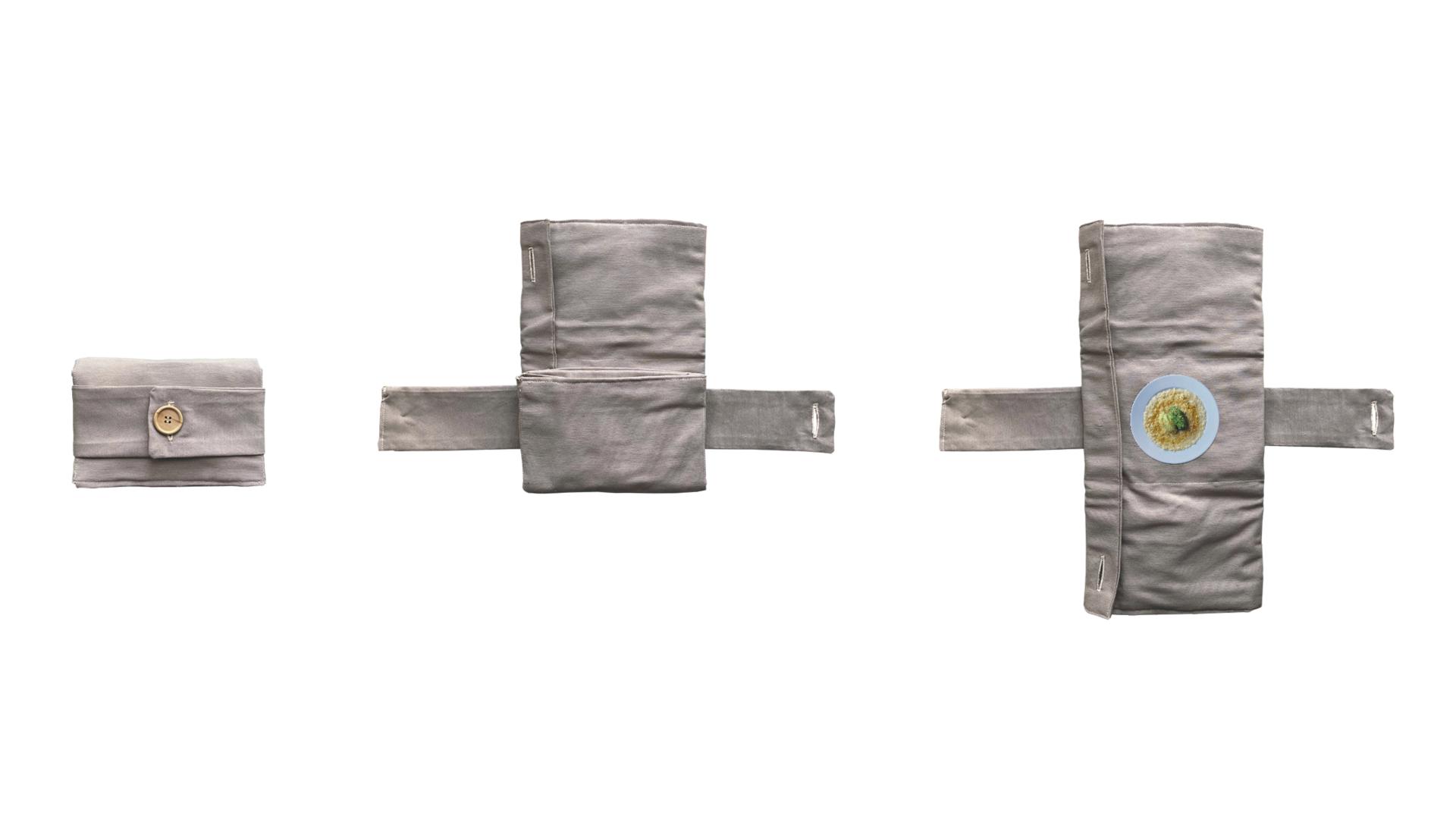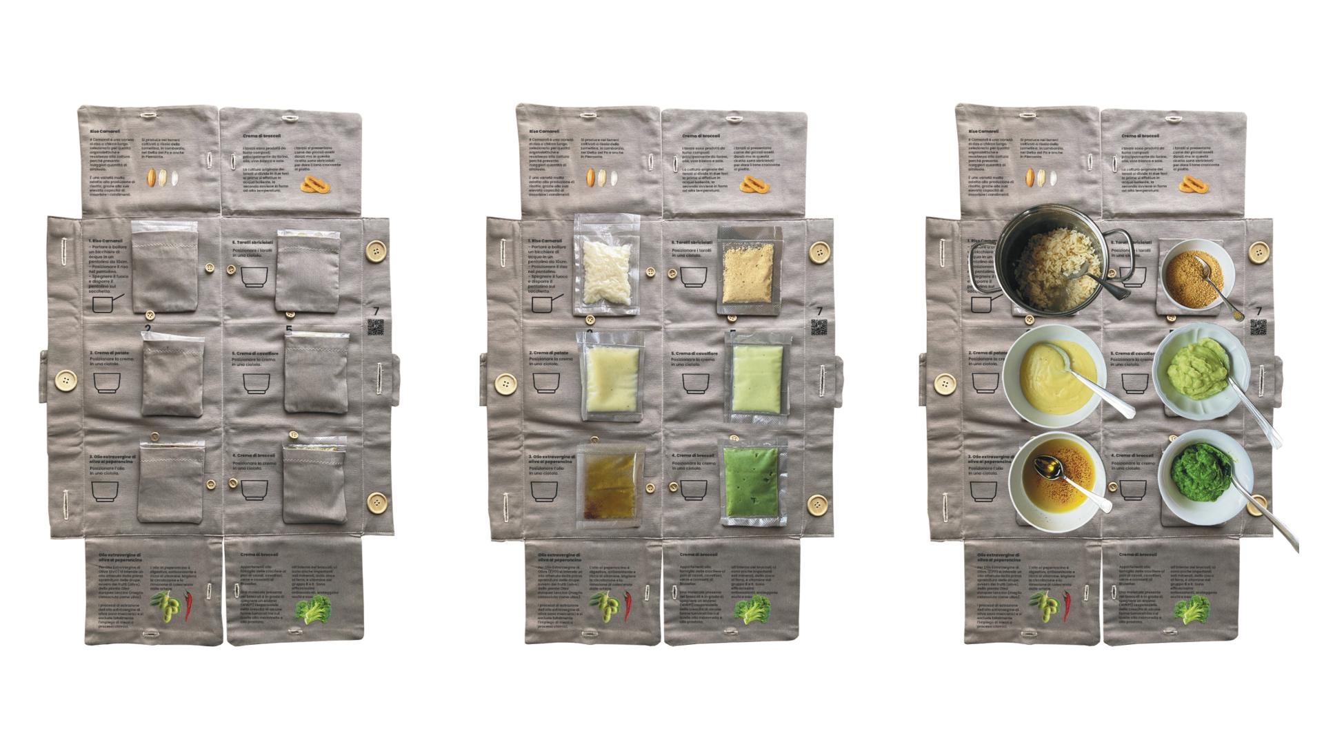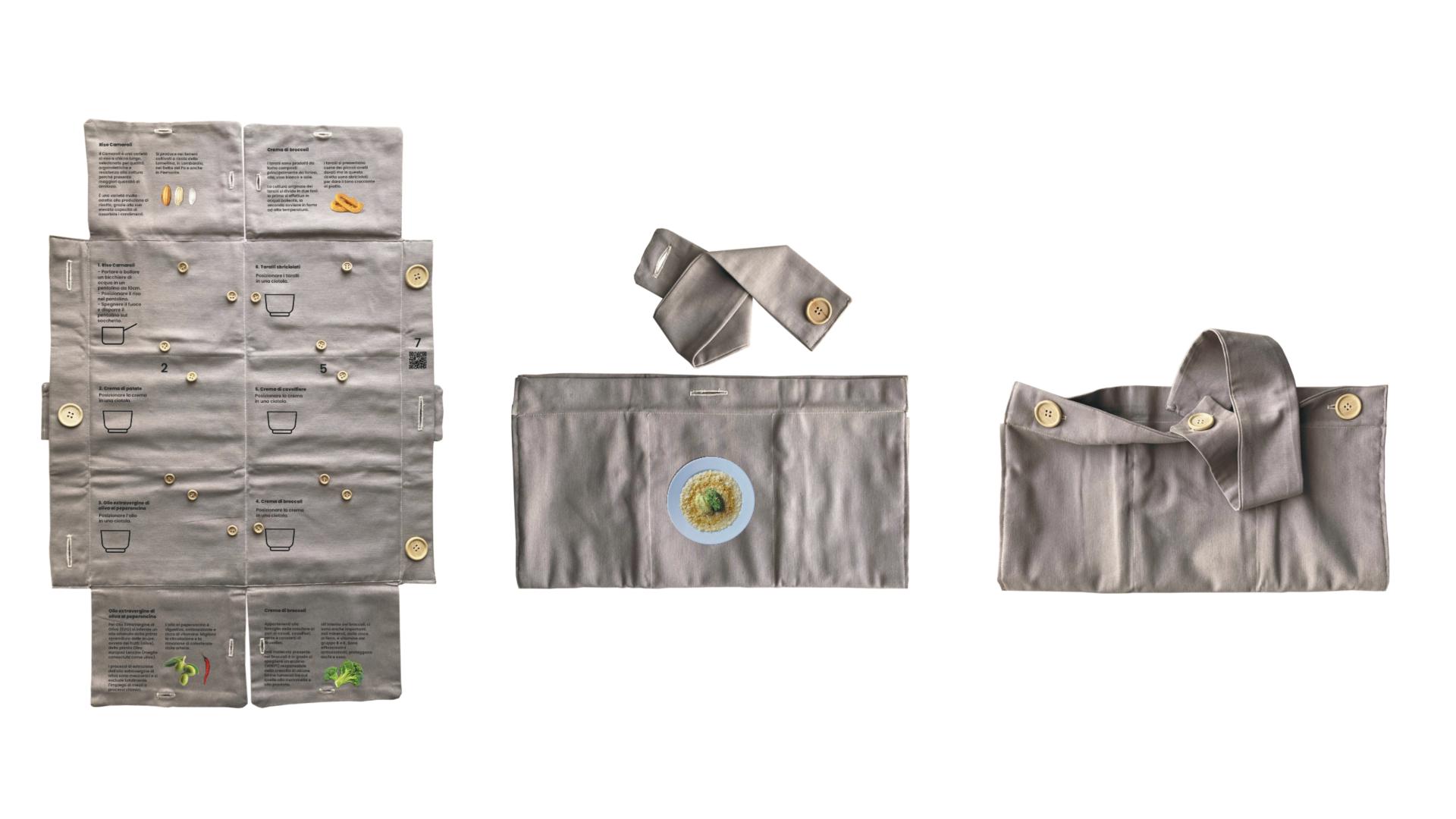 The proposed project is a resealable fabric packaging in which ingredients prepared using the vacuum technique are stored. The product is designed in fabric, precisely in recycled cotton, to ensure flexibility, ease of use and allows it to be reused several times. As the culinary experience takes place on the product itself, the fabric allows for increased thermal resistance and in case it is easily washed. At the beginning of the experience, the product has a shape of 20x15cm, later, during the cooking experience, the dimensions are 50x75cm. In spite of this, the dimensions have been tested and studied respecting the proportions and dimensions of standard tables in any domestic environment. The opening of the product is simple and intuitive for the customer as it only involves following the folding of the product itself. Inside the product there are bags attached with buttons that act as a support for the biodegradable sachets with the vacuum ingredients. The wooden buttons, designed to avoid the use of plastics or other heavy fasteners, are replaceable and recyclable without environmental damage. In addition, the distribution of the perimeter buttons allows the product to be closed at the end, transforming it into a shopper bag to be carried on the arm. The product, together with the inner bags, become the tools to be used to store produce during harvesting and foraging activities.