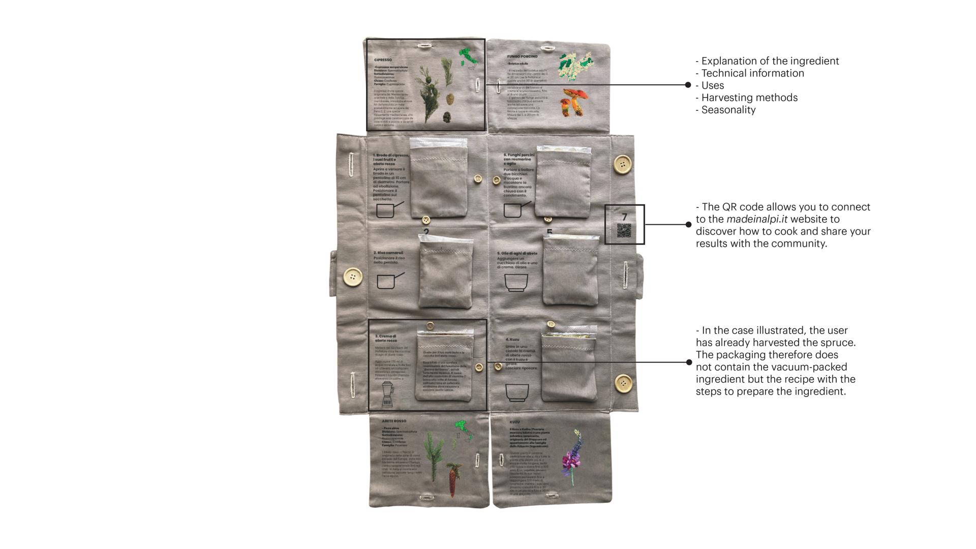 Nowadays it is difficult to know the difference between natural and artificial food. Meals are often conditioned by time and packaged foods that do not convey values and emotions. The concept proposed, starting from a personal experience, is developed in the uncontaminated context of the mountains and aims to re-establish a connection between the human being, the environment and what it has to offer. Foraging becomes the focus of this dialogue as it requires the dynamic but respectful participation of the user and all his senses. The project aims to stimulate and make the user more aware of the importance of the food that nature offers us, in order to establish a proactive dialogue. Foraging is the new frontier of food sustainability, although it is an attitude that has always belonged to man and animals. It enhances spontaneous natural biodiversity and allows us to rediscover ancient places, flavors and traditions The form of foraging explored is conservation, which focuses on harvesting invasive species and those that in some way damage ecosystems. However, harvesting is closely linked to climate, altitude and seasonality. Although the activity allows people to increase their awareness of the environment, the proposed concept aims to take the foraging experience to the next step through a "dynamic recipe book" that aims to create a strong connection between the user and natural foods. After choosing the recipe and the ingredients, the product can be ordered online. In the packaging, the foraging ingredients are provided by information on uses and characteristics, with a map of areas where the food can be found and harvested. The design of the packaging aims to guide the user through all actions and to complete the recipe within the package. At the end of the dining experience, the proposed design allows and suggests the user to use it to go to the mountains and collect natural food in a sustainable way.