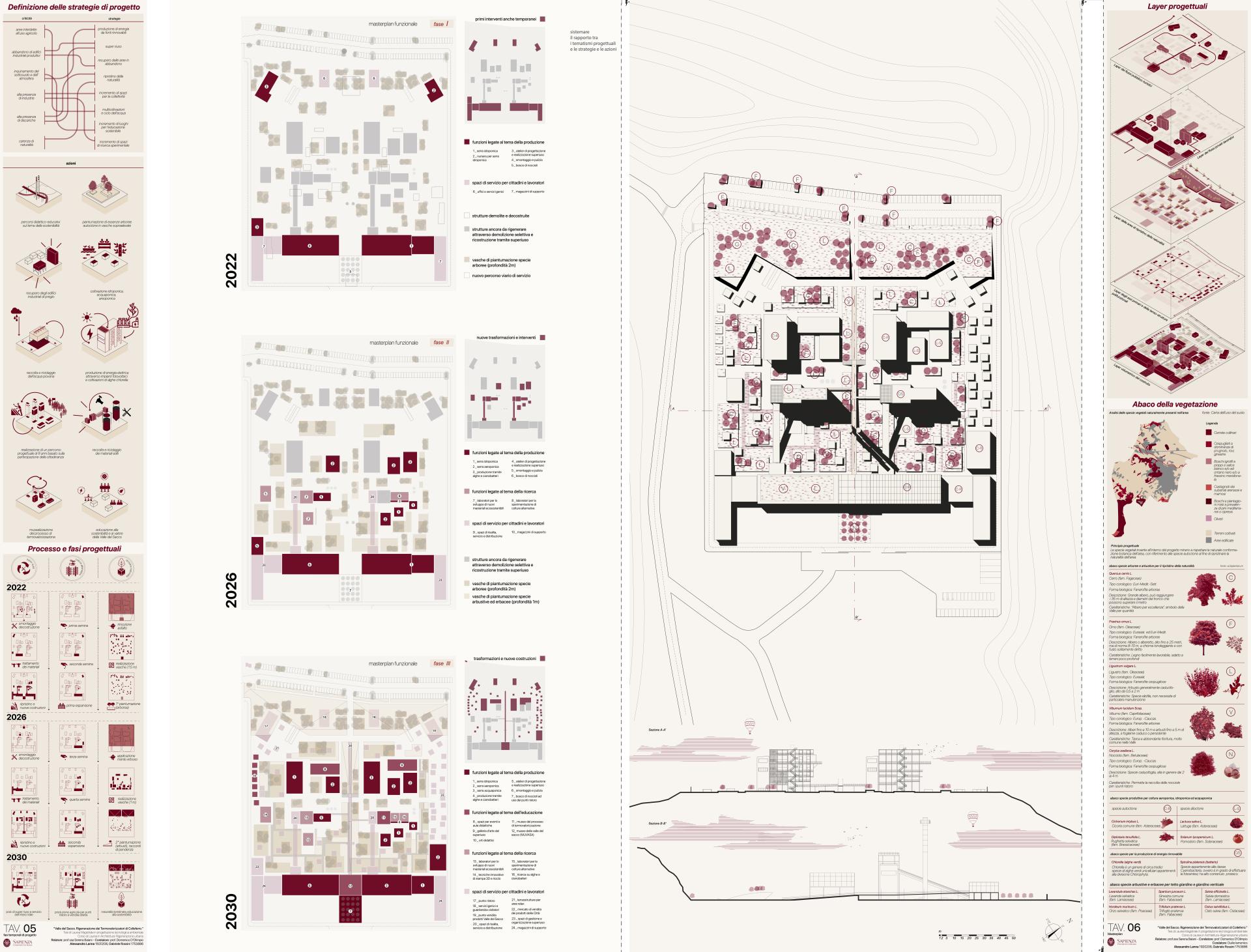 Industrial aesthetic is to be progressively replaced or improved by vegetation, the principles of environmental sustainability are applied to buildings as they acquire functions, inclusion occurs as a place whose access is currently closed to the public gradually opens up to become the center of a new era for Colleferro: all these processes are determined by time and in turn mark the succession of phases.