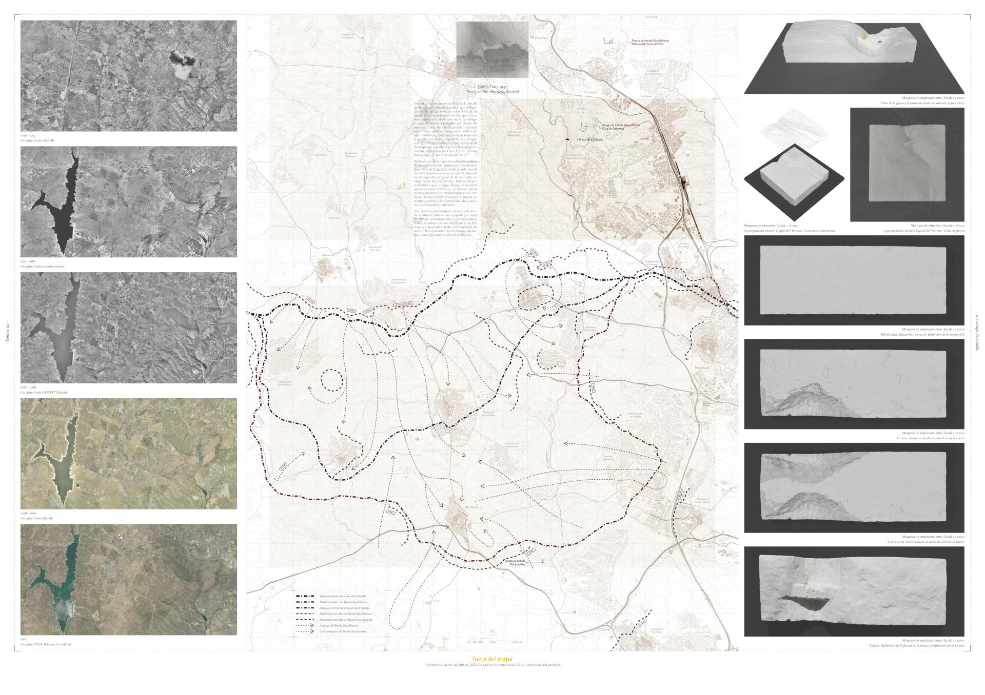 The project, an archive of the memory of the landscape, is born as the union between two stories that, although they did not happen at the same time, they did happen in the same place: the construction of the El Gasco Dam and the outbreak of the Battle of Brunete. The program has a double objective: on the one hand, to recover and store the vestiges of these two events, and on the other hand, to exhibit them, so that they cease to belong to no one and come to belong to all of us.