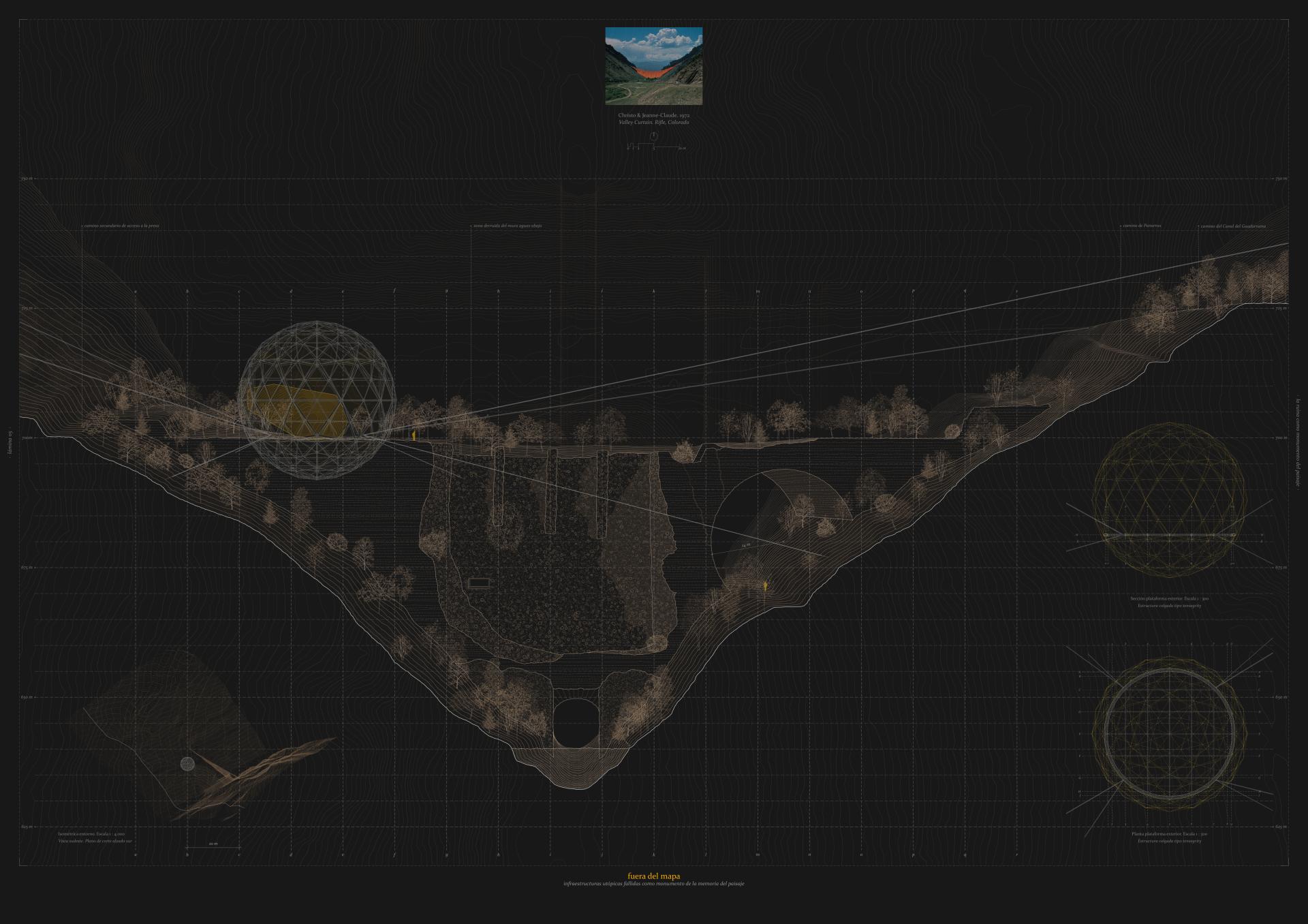 If the scale of the spaces inside the dam is related to the scale of the objects that are stored, in the case of the exterior dome the situation is almost the reverse: to respond to the landscape. The introversion of the archive contrasts with the monumentality and artifice of the dome, which is intended to be shown precisely in this way, as an artifact that summarizes the contradictory essence of the project.