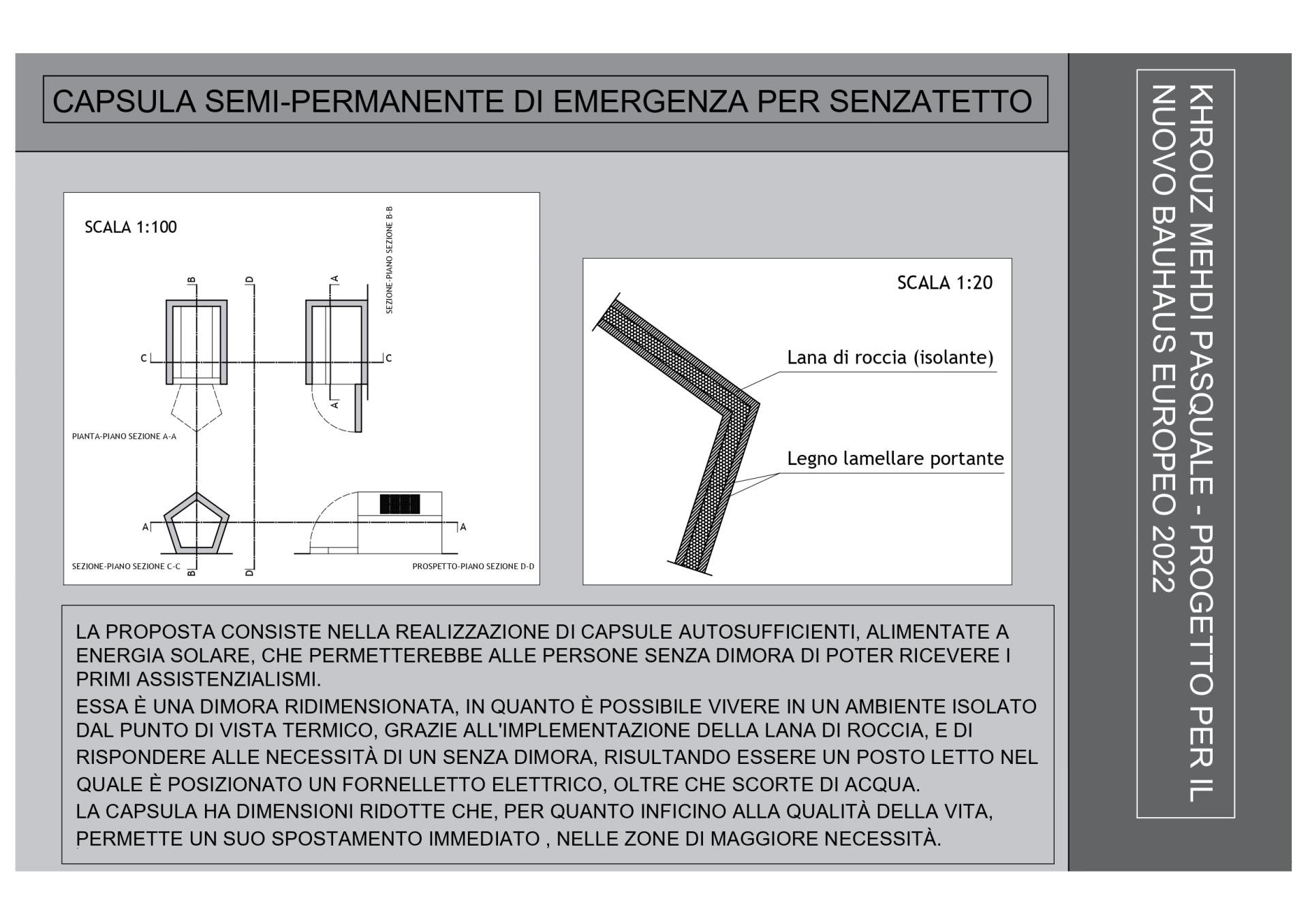 THE PROPOSAL CONSISTS IN THE CREATION OF SELF-SUFFICIENT CAPSULES, POWERED BY SOLAR ENERGY, WHICH WOULD ALLOW HOMELESS PEOPLE TO BE ABLE TO RECEIVE THE FIRST WELFARE. IT IS A RESIZED RESIDENCE, AS IT IS POSSIBLE TO LIVE IN AN ENVIRONMENT ISOLATED FROM THE THERMAL POINT OF VIEW, THANKS TO THE IMPLEMENTATION OF ROCK WOOL, AND TO MEET THE NEEDS OF A HOMELESS, RESULTING TO BE A PLACE IN WHICH ELECTRIC STOVE, AS WELL AS STOCKS OF WATER. THE CAPSULE HAS REDUCED DIMENSIONS FOR BE MOVED ANYWHERE.