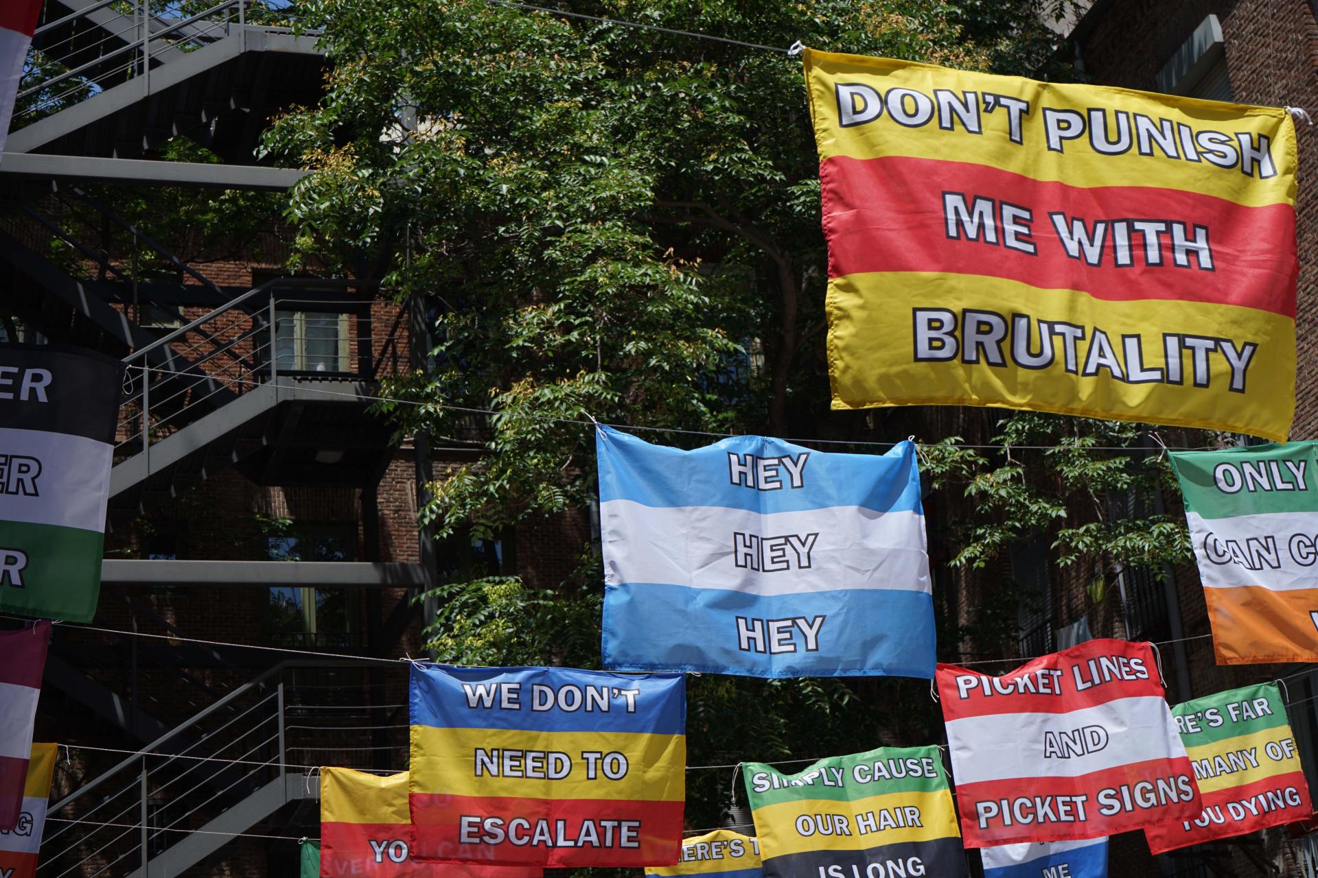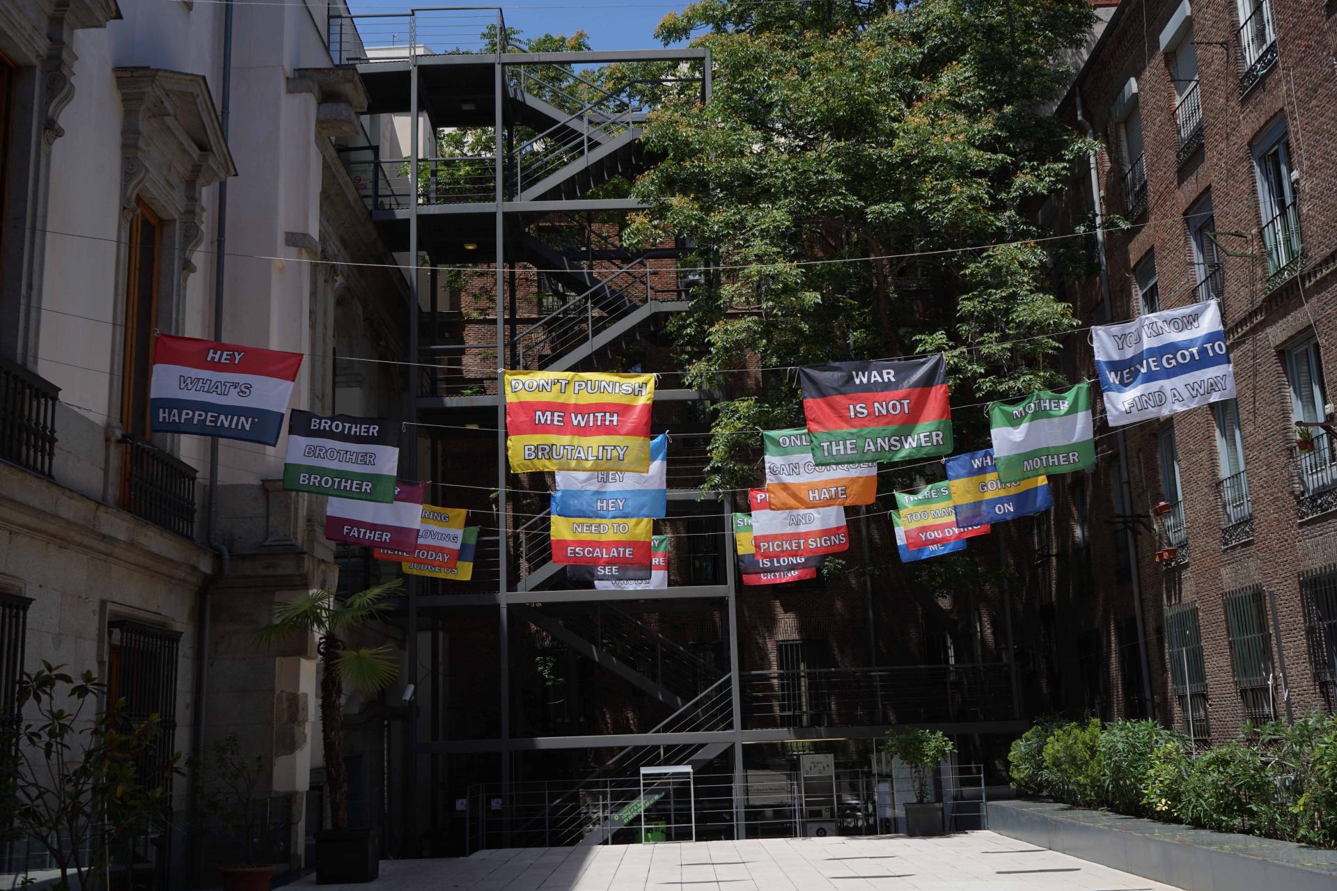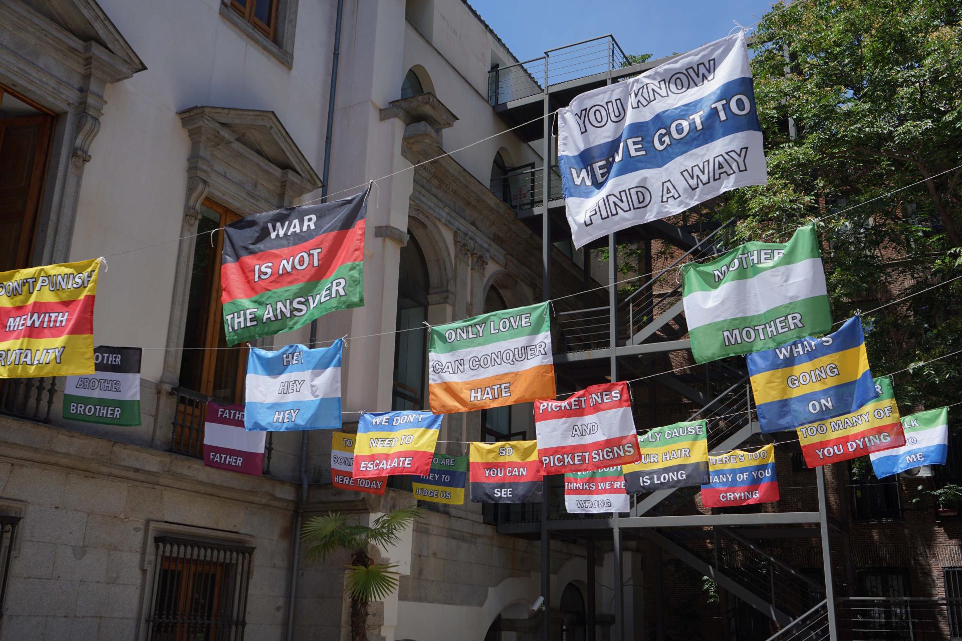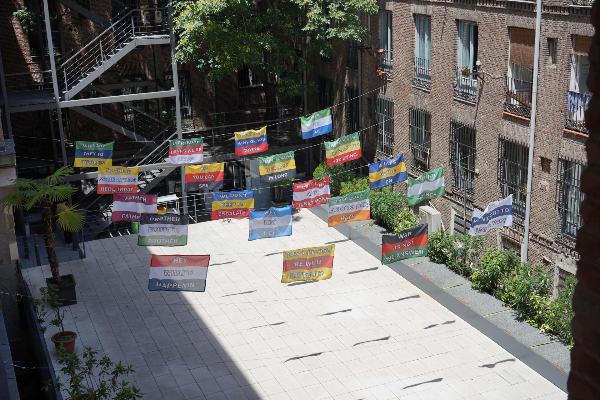 To do this, I have intervened the courtyard of the Altamira headquarters of IED Madrid with twenty flags in which you can read the lyrics of the song printed on them. I decided to use flags as a graphic support for what they represent (communication tools to claim values, represent collectives, organizations, nations and so on, so we deduce that they are also political weapons).