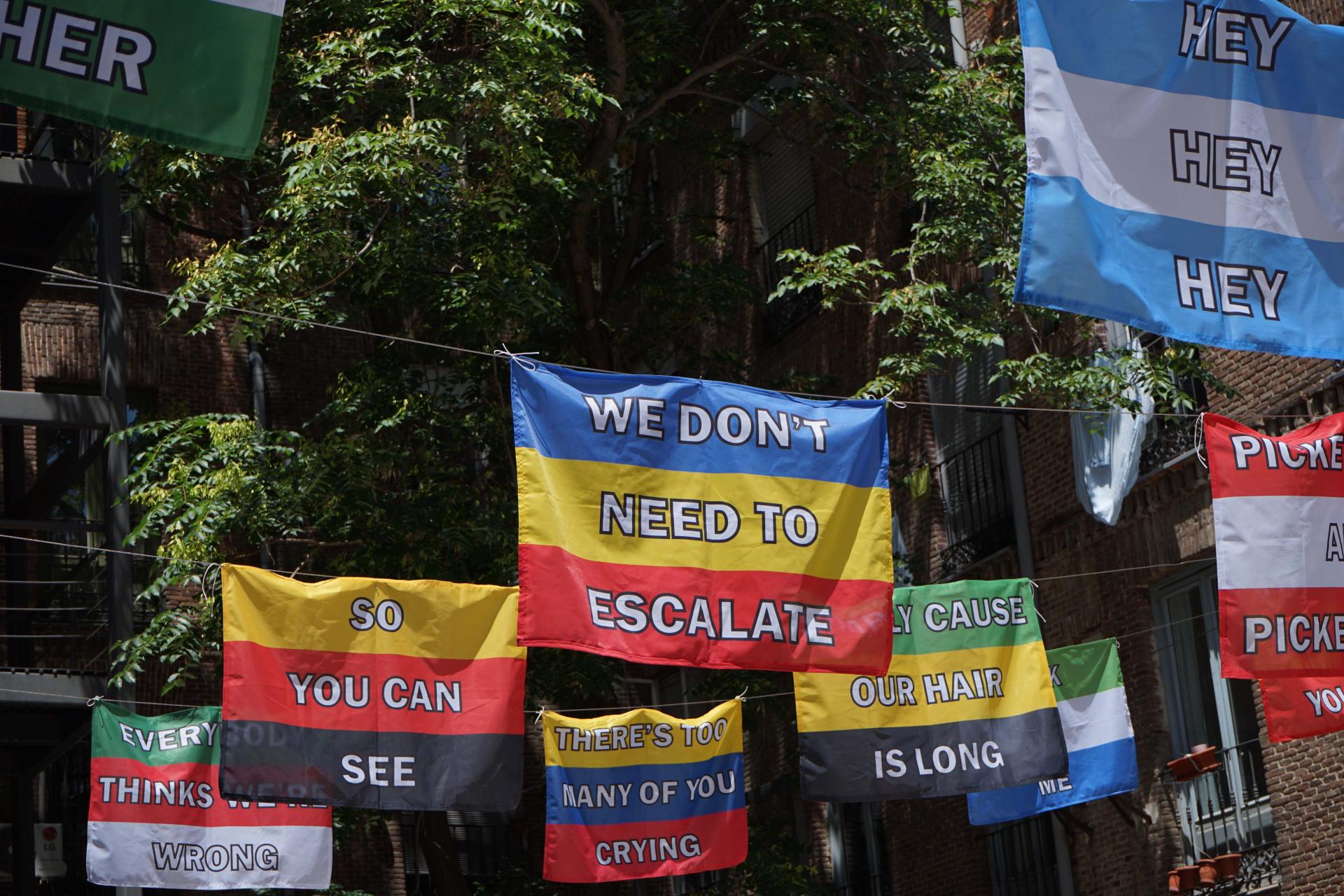 I have printed the lyrics on 70x100 cm flags for all the symbolic value that a flag has and to put on the table all the geopolitical conflicts and all kinds of conflicts that have arisen in recent months. The timelessness of the song is essential in my work, everything I have done has been done for that reason, every day that goes by the song takes on more meaning and that is where the magic arises: we have not fixed anything, we have not changed anything, on the contrary, the problems have increased and it is incredible and exciting to listen to a song that was written fifty years ago and that seems to have been written today. My work also highlights the most important characteristic of music, timelessness.