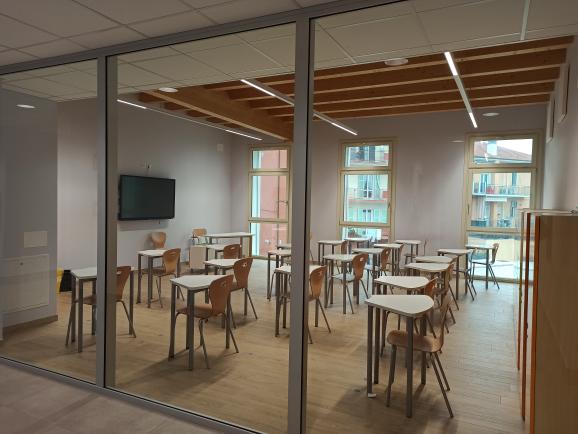 The walls of the classroom are made by glass, and this allow to create a sense of community among students that belong to different courses. Such use of the windows and the glass-walls enable also to get the best environment thanks to the artificial and natural lighting control.