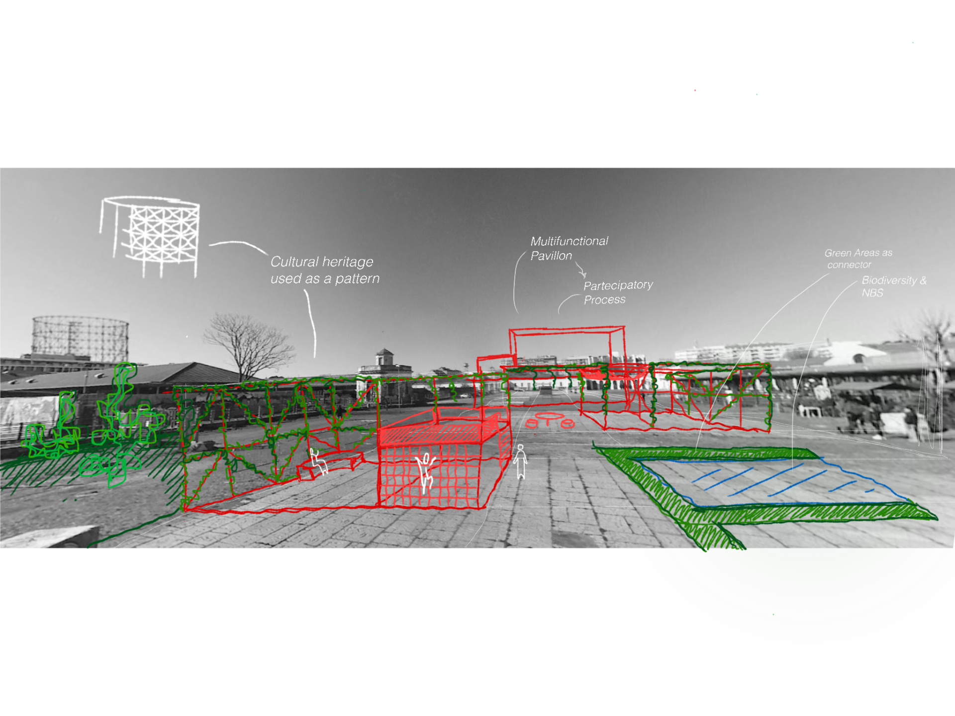 Keeping in mind the importance of the cultural heritage of the area where the concept is located, a modular base for the pavillons has been developed (the primary element is a cross-similar structure which goes to compose pattern as reference to the Gazometro).