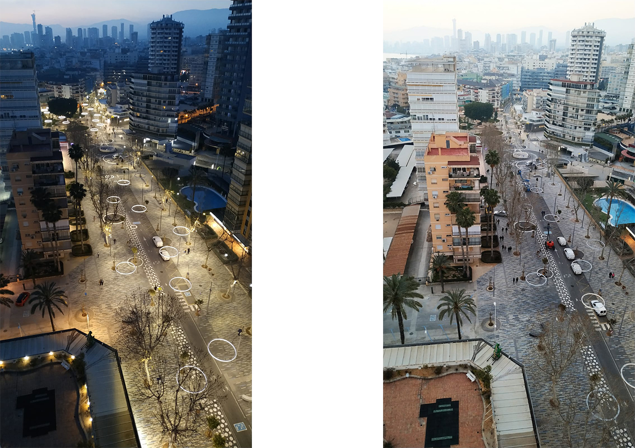 1. - Claiming the public space as an experiential and relational place. Reduce the six lanes for the car to a single lane. Transform the character of the road into a "pedestrian priority". The Avenue ceases to be a place where vehicles pass by and begins to concatenate public spaces, which enhance and order the urban scene. The transformation of the iconic road into a space for relationships arises from the Benidorm Citizen Participation bodies and the elaboration of the Sustainable and Integrated Urban Development Strategy (EDUSI).