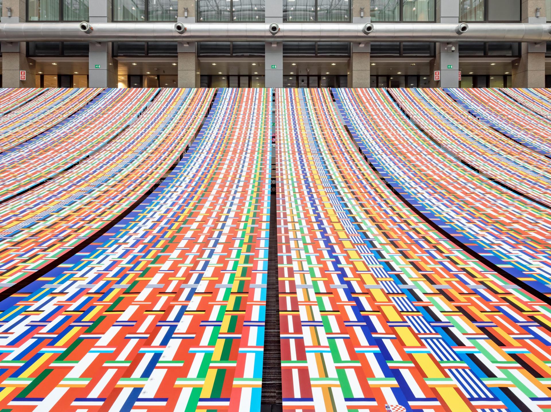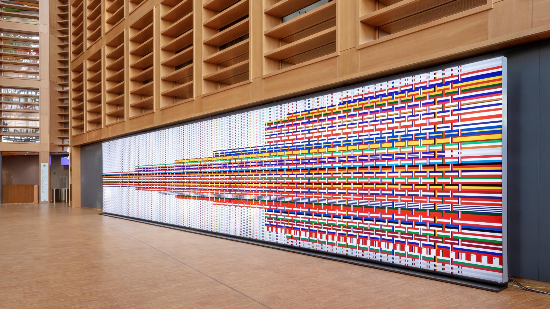 The design provides an experience to be part of Europe in a very physical sense, being surrounded by this 650 m2 of mixing colors in Justus Lipsus building. In Europa building, the artwork is also a data-weaving of the construction of the European Union, fitting the scale of time and the successive entries of new members in the European Union. It shows by a process of creation wich takes a long time and is complex, the time and the complexity that this great European project needs to exist.