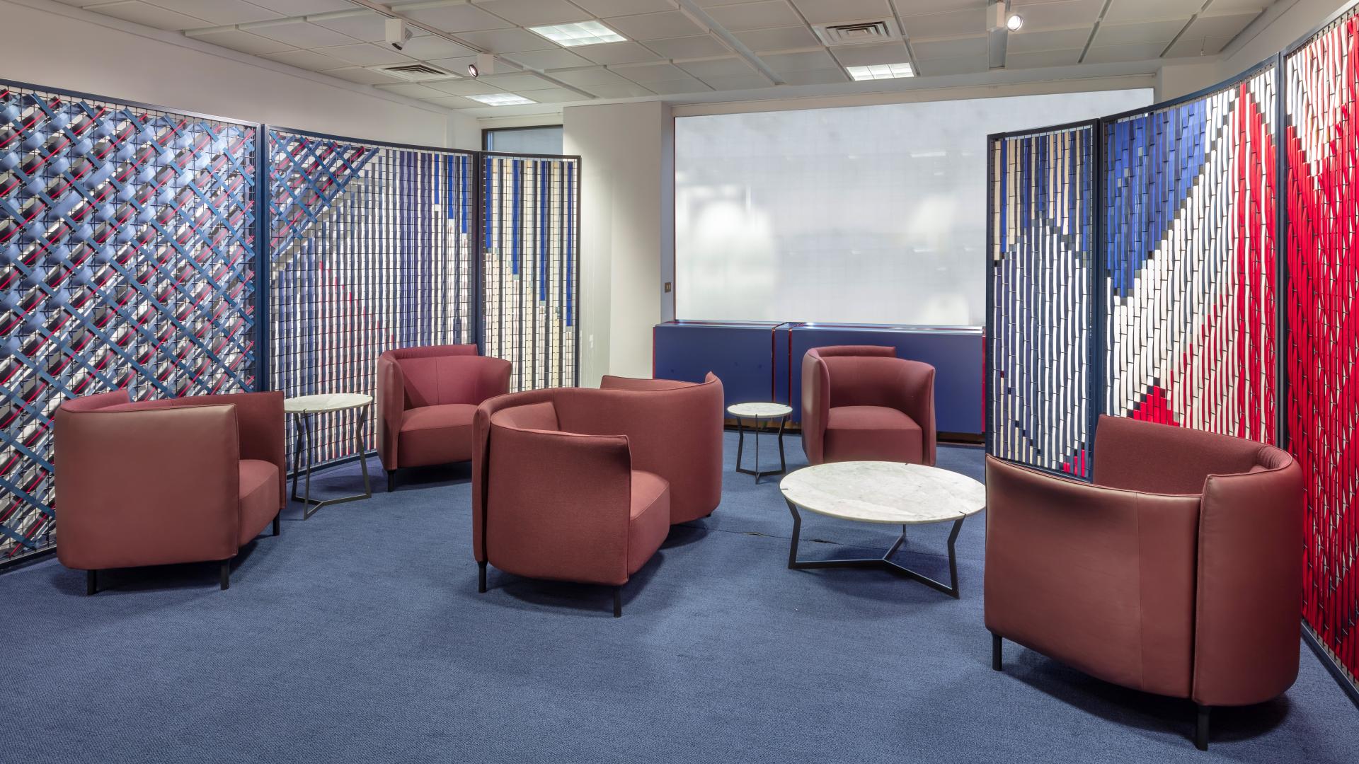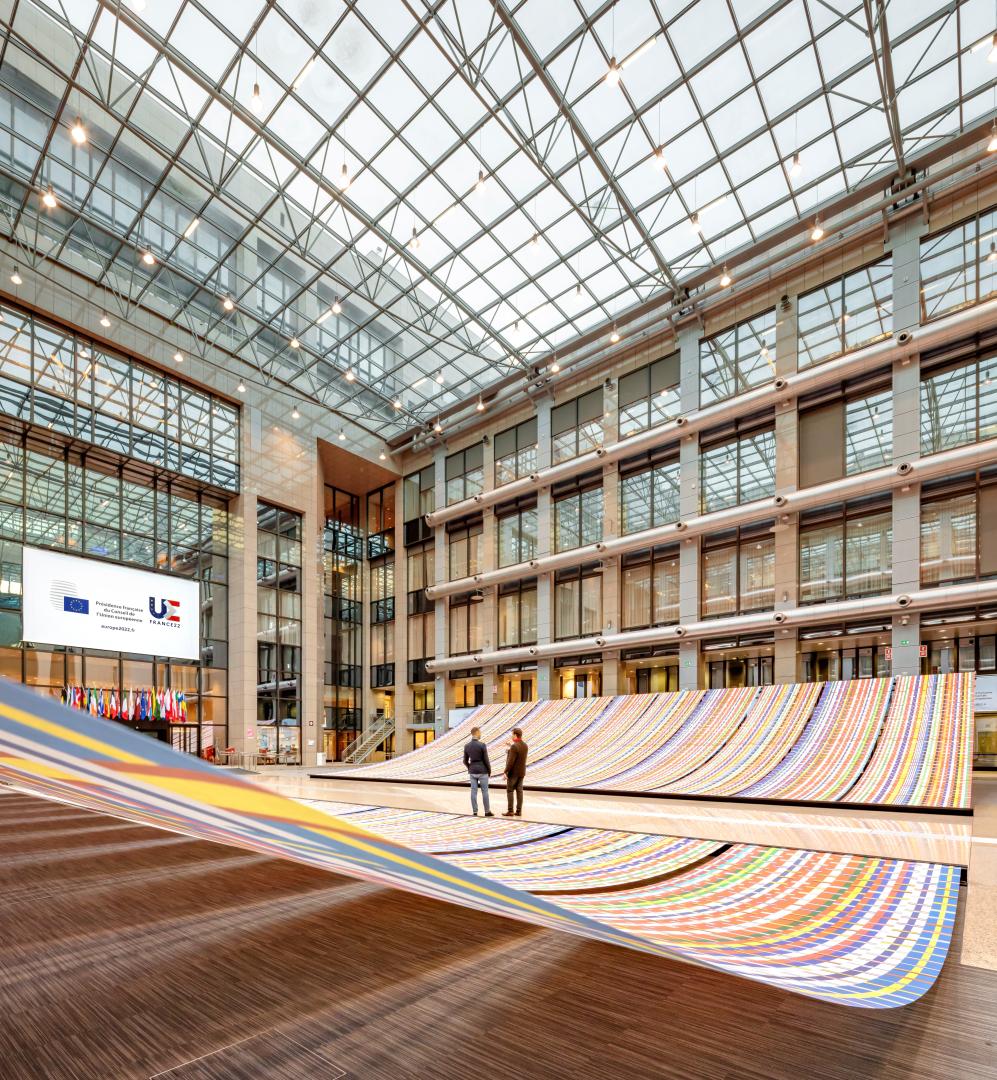 The project started as an international competition opened to architects from all European Union. It's the first time France is proceeding this way. The equality and opening to diversity were at the heart of the project. The project has proved to be inclusive in its very conception since each of the coloured ribbons relating to each country has been the subject of protocol and diplomatic validation by the embassies in France of each EU countries. It is, by its very nature, the expression of a project of civic commitment on a European scale. 4 creators made this concept which is exceptional in a time of hyper-impersonating to share the credit of a creation this way in a sense of equality. In terms of inclusion, from the beginning of the project, we wanted to involve and promote artists and creators from various fields, including young artists. The furniture has been created by French creators in partnership with the French Mobilier National, a weaving creator Jeanne Goutelle and the artist Jacques Perconte. As the project is deployed in secure EU buildings, it is only partially accessible to the general public. We have voluntarily compensated this by offering a maximum of visibility and sharing of the project on the web and social networks, in connection with our client. To this end, three video clips were made and 27 instagram stickers in the colours of the member states were delivered for distribution on networks of all countries. It is worth noting that a 28th vignette was produced at the beginning of March in the colours of France and Ukraine, labelled L’Étoffe de l’Europe™ to mark the solidarity between EU and Ukraine desired by the French Presidency of the Council of the EU. It is important to underline that we have voluntarily sacred a budget in the global financial envelope of the project to propose, with a dedicated curator, an inclusive exhibition not originally planned, shedding light on 10 artists of the young French artistic scene living in Belgium.