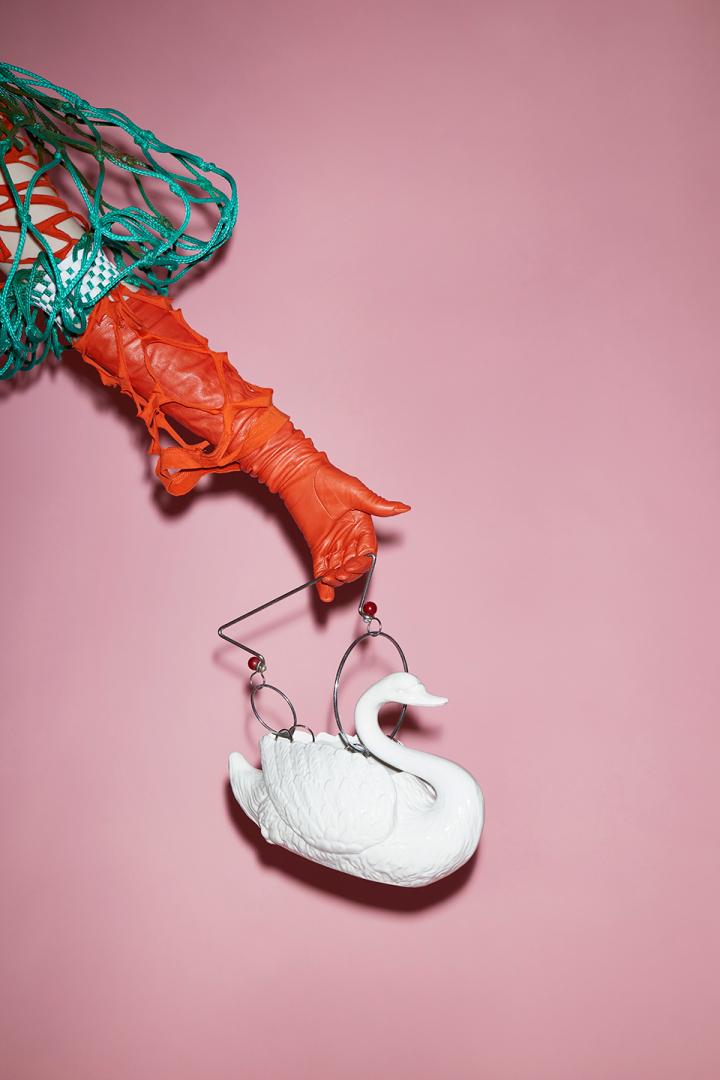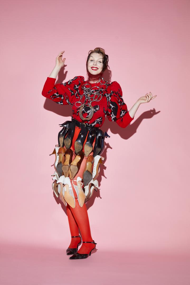 The work originates from the muse created to give equal value in discarded material a persona. A crazy-cat-lady-like muse that hoards every possible item in her house, valuing her lowstatus single-use-waste-collection equally to her high-status-material jewelry box. Stating that every material has a value that one can enhance and add to through recontextualization. The collection lifts a serious cause with a touch of humor and therefore make the subject of overconsumption more reachable.