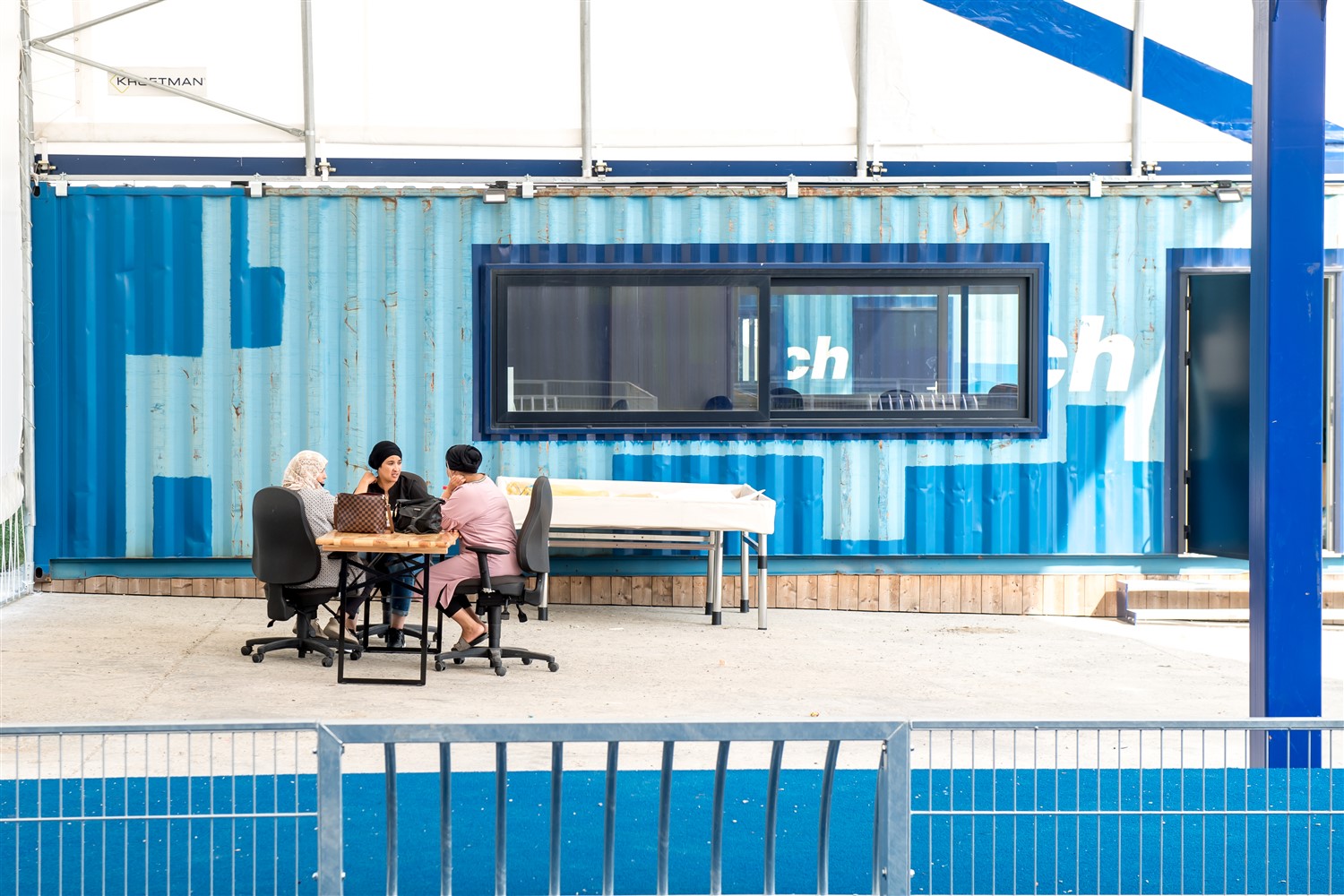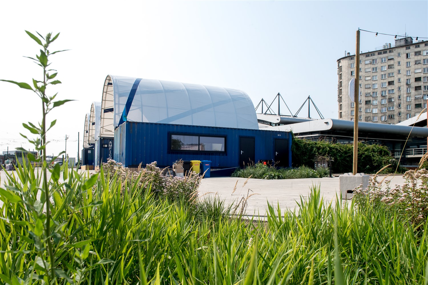 Imagined by 1010 Architecture and built in place of a concrete industrial wasteland, Molenwest Square is made of former sea contenairs, transformed into premises, linked together with big blue arches. It offers a place for the inhabitants and the associations : from a discussion group of mums to a fablab but also cycling lessons, everyone is welcome in Molenwest Square.