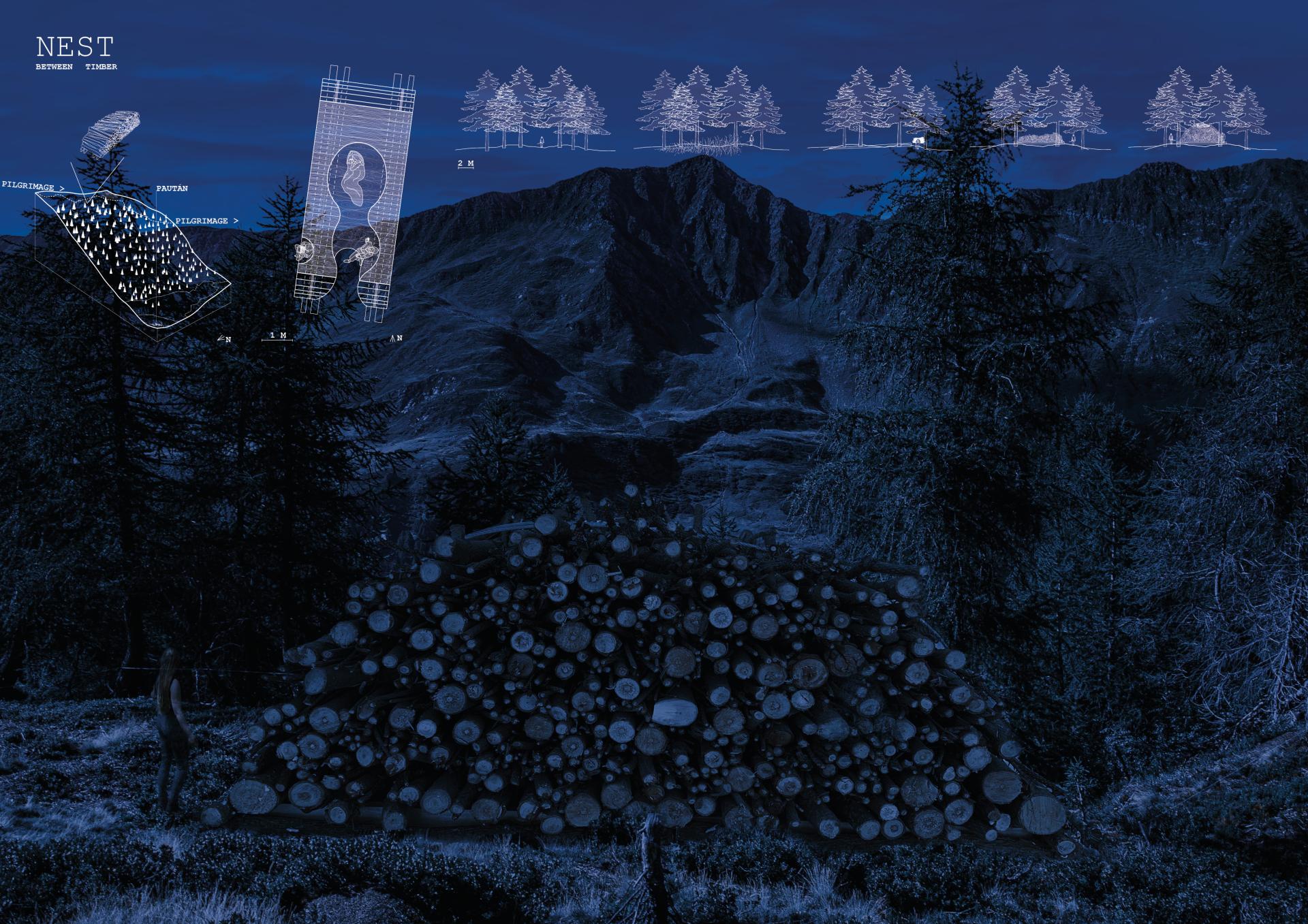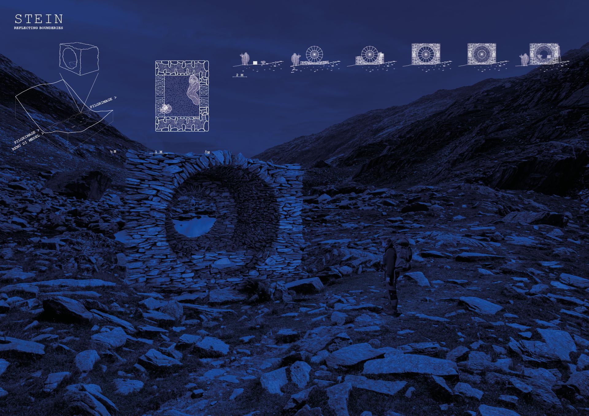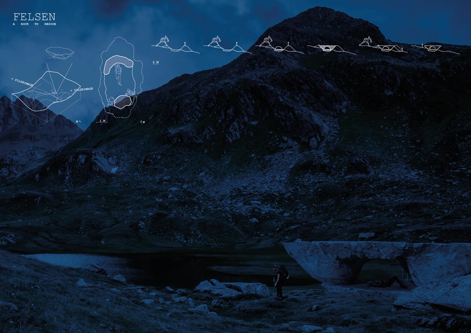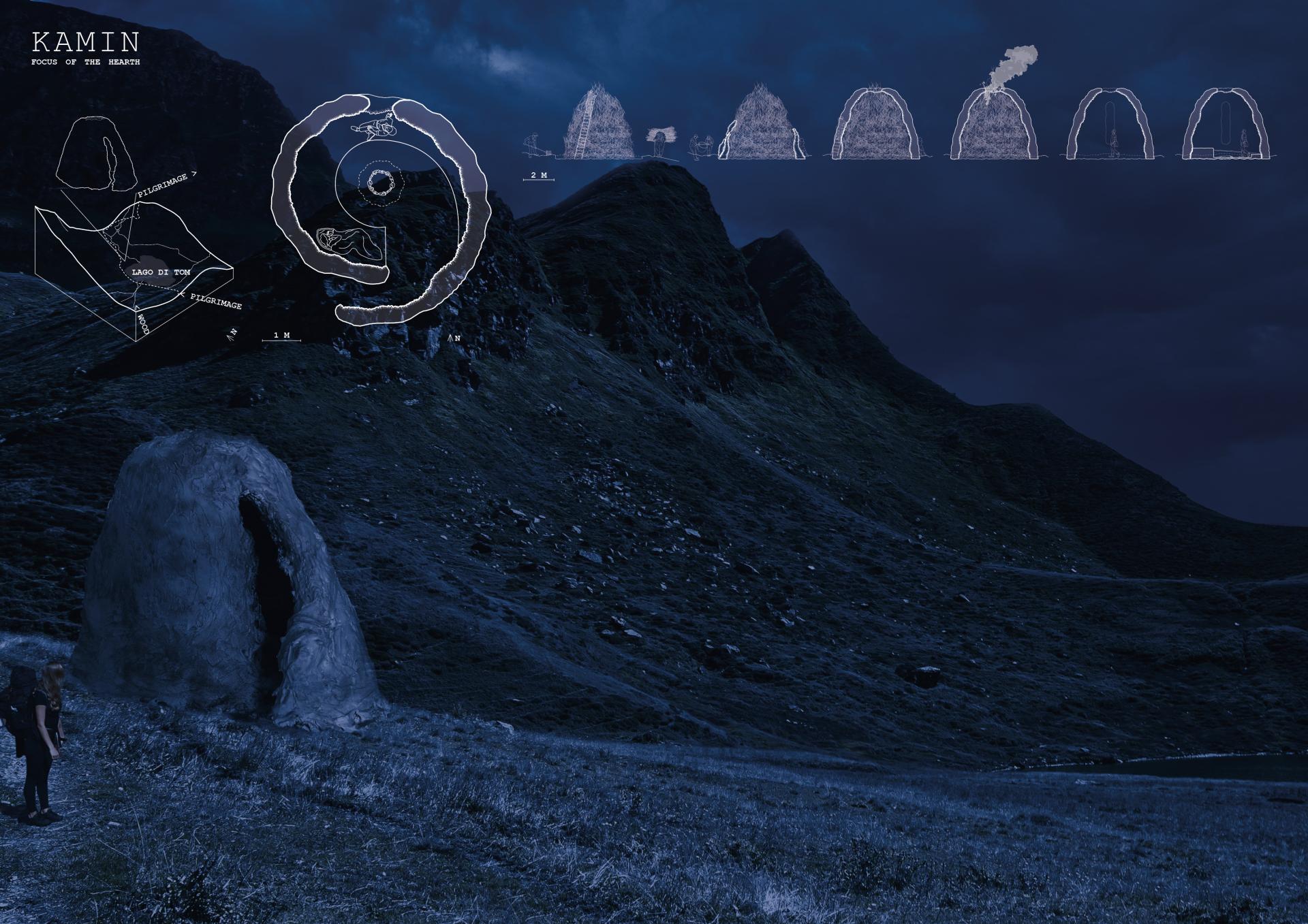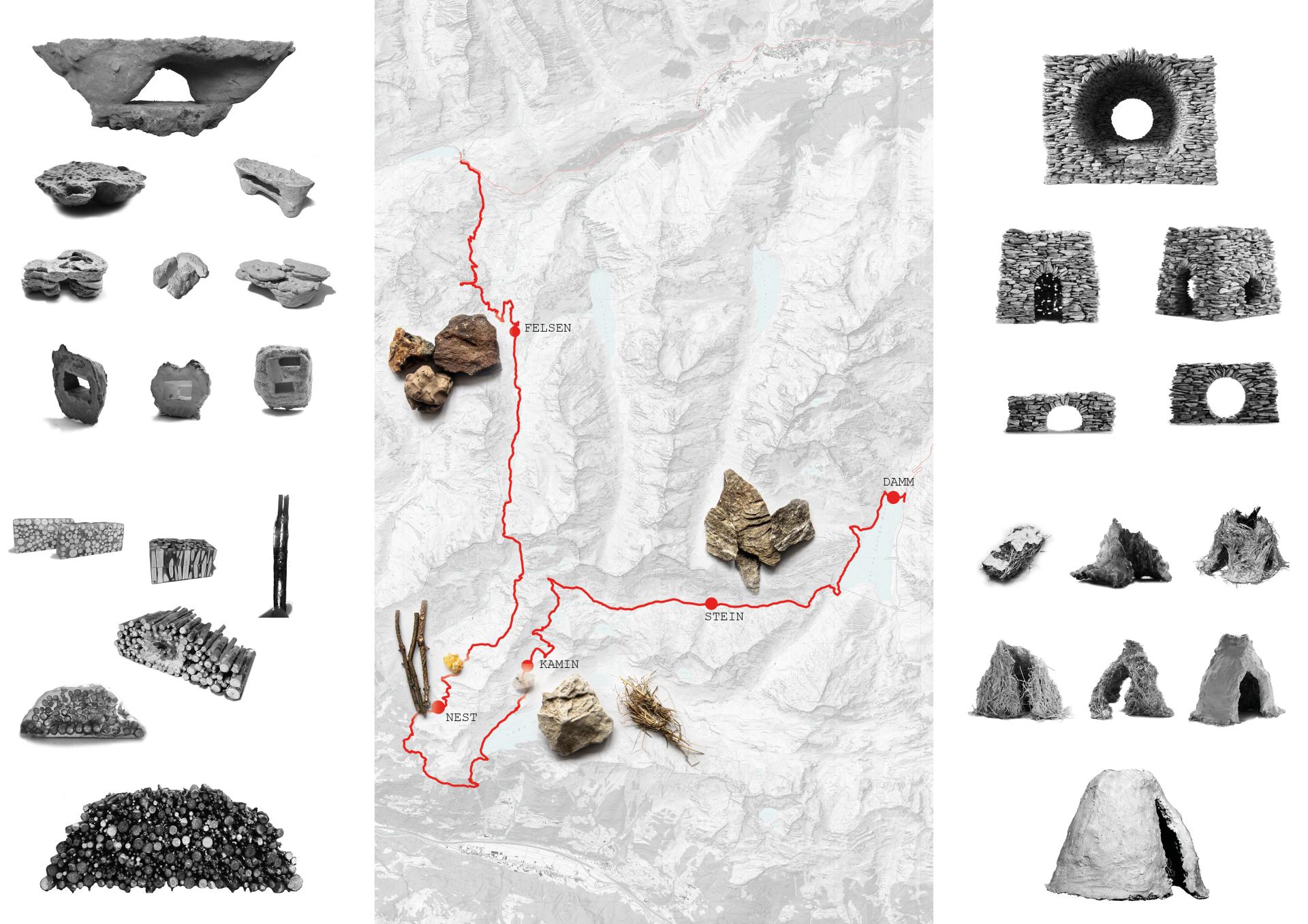 Pilgrimage is the circular design of a 5-day trekking tour in the Alps, the design of 4 mountain shelters and a manifesto. The shelters are made from raw materials like stone, wood and lime, which are found on the place where the shelters are built. The aim of the tour is to reconnect hikers with nature, and make them aware of the nondestructive use of natural resources and the need for nature conservation. The tour ends with a manifesto to stop global warming, carved out in the wall of a dam.
