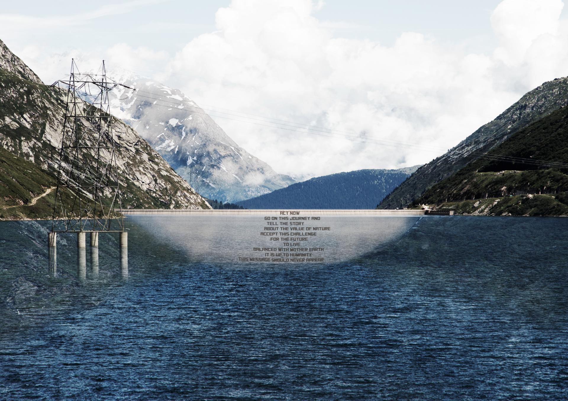 Pilgrimage “research to the source” is a 5-day hiking tour through the Alps. The project consists out of 5 interventions along the trail. Four shelters where architecture creates a symbiosis between man and nature. The fifth design at the end is a manifesto carved out of the existing dam. A dam may seem sustainable and provide for electricity, but it also destroys ecosystems. It brings harm to nature only to provide for a small part of human existence. The destruction of nature should stop: ACT NOW!