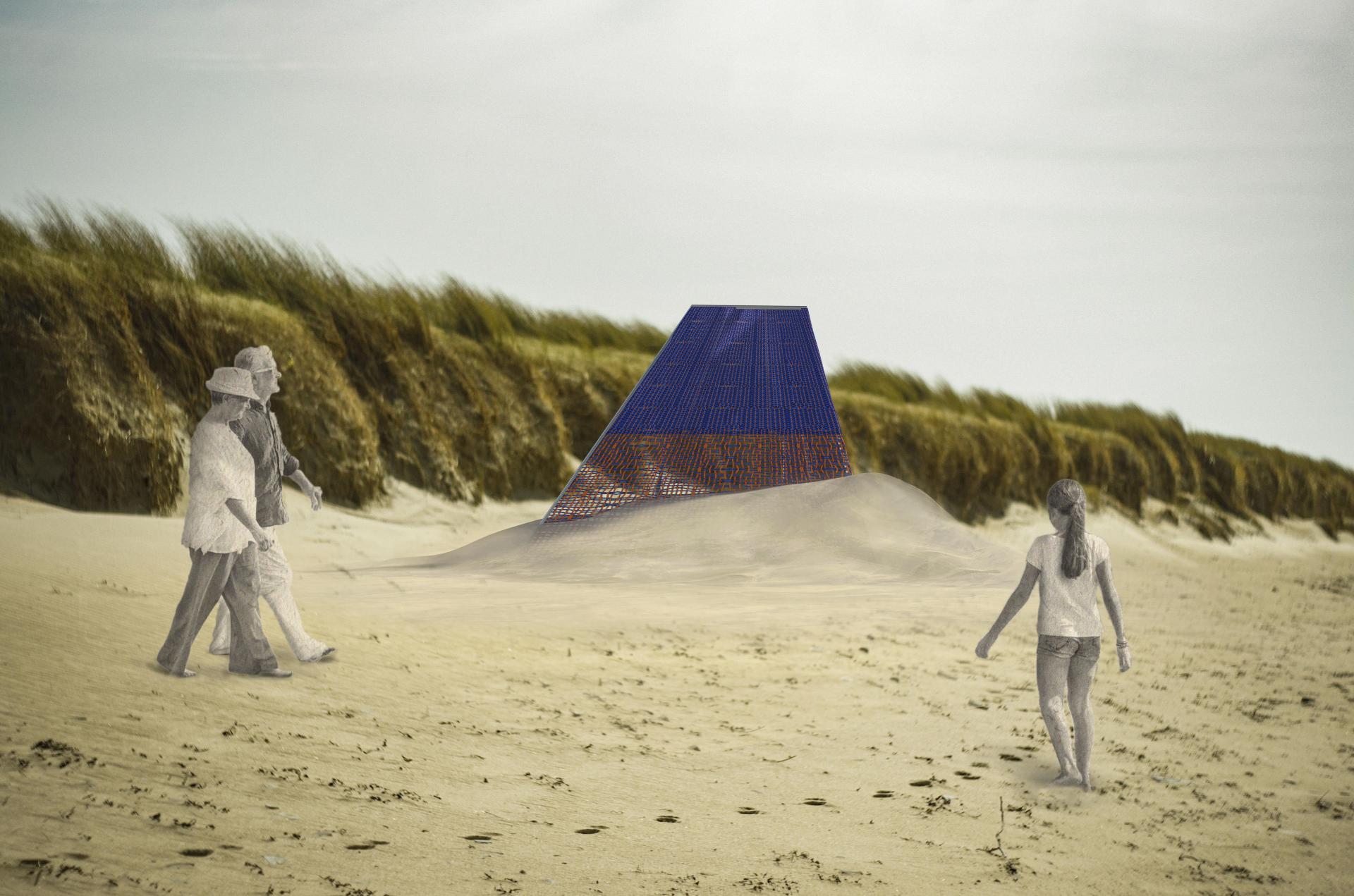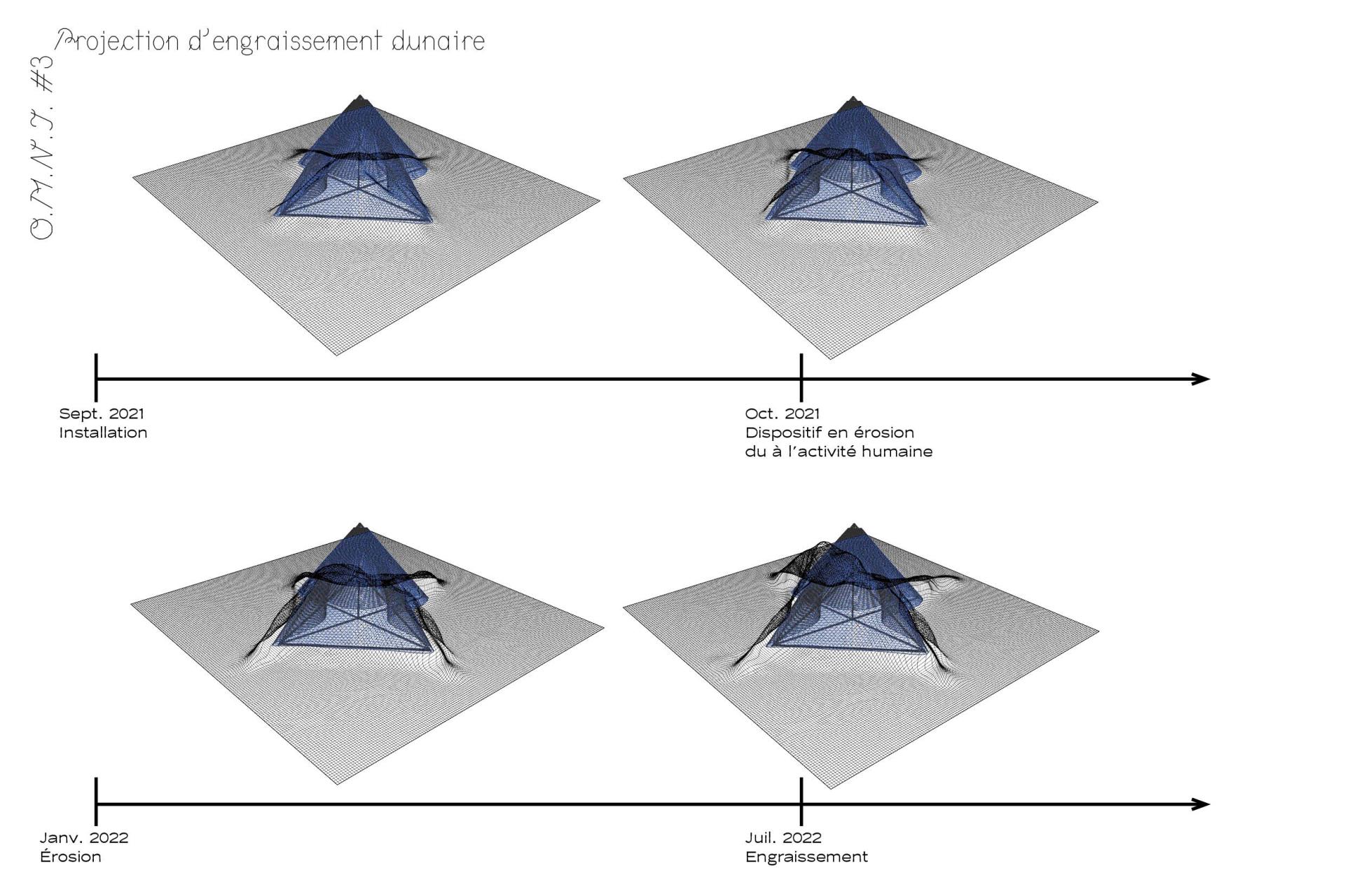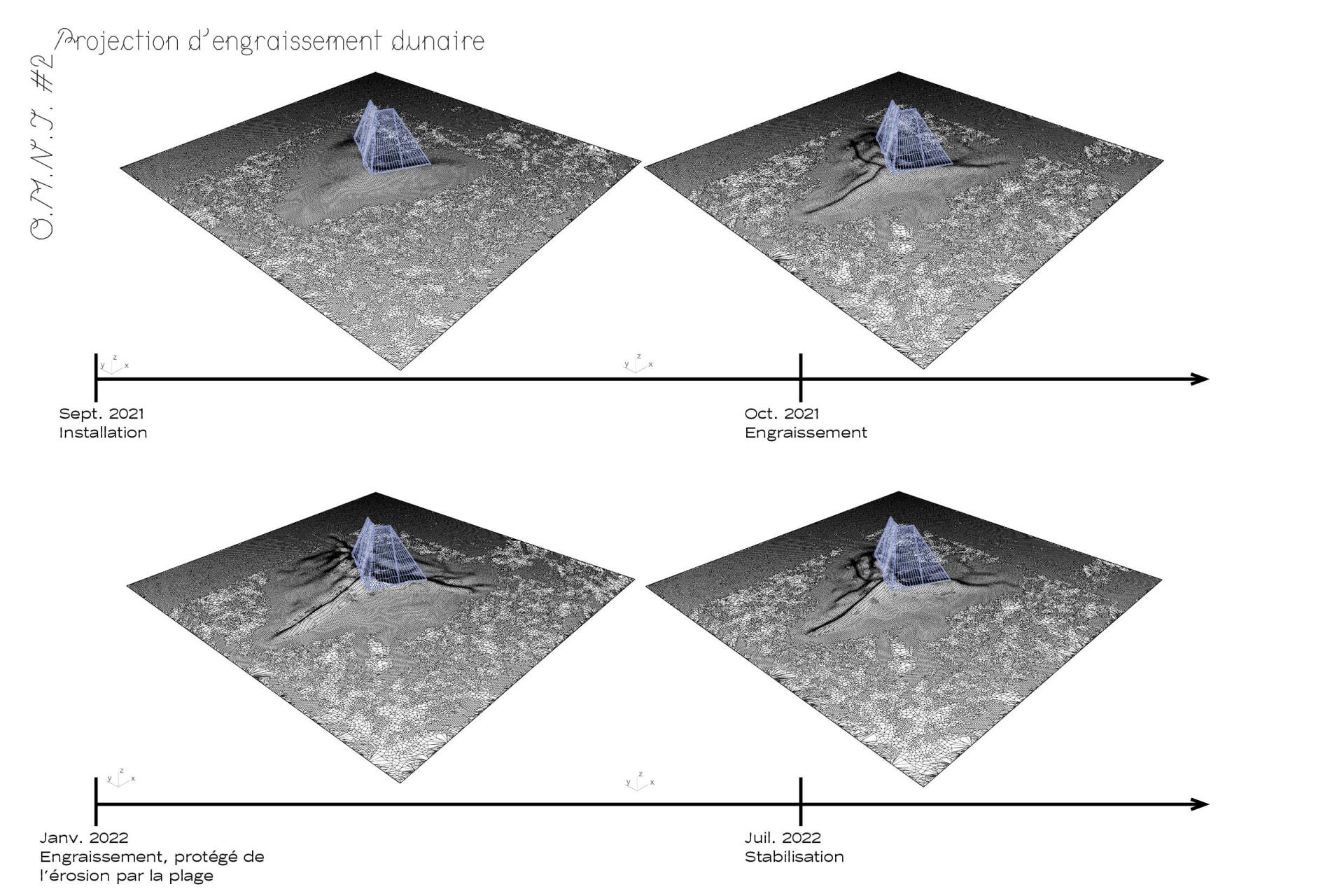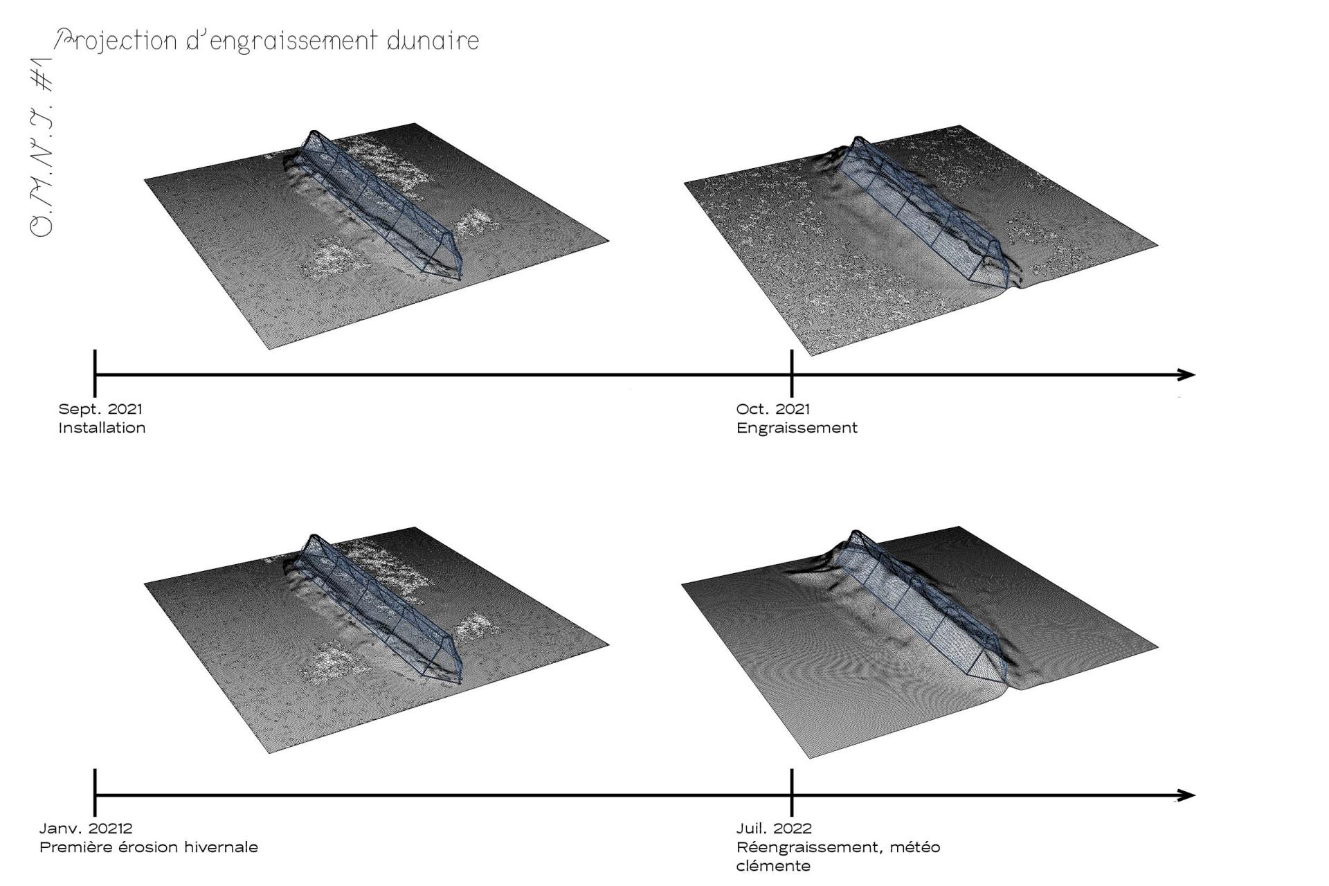 Unknown Moving Objects are both environmental and design tools, proposing to reduce dune erosion and to show the evolution of forms in autonomy in nature. These objects are thought as a matrix stacking the sand and forming artificial-natural dunes. These objects are hybrids using environmental forces to make forms grow by themselves.