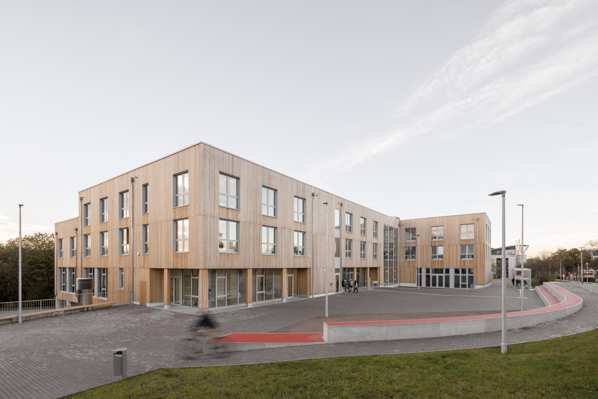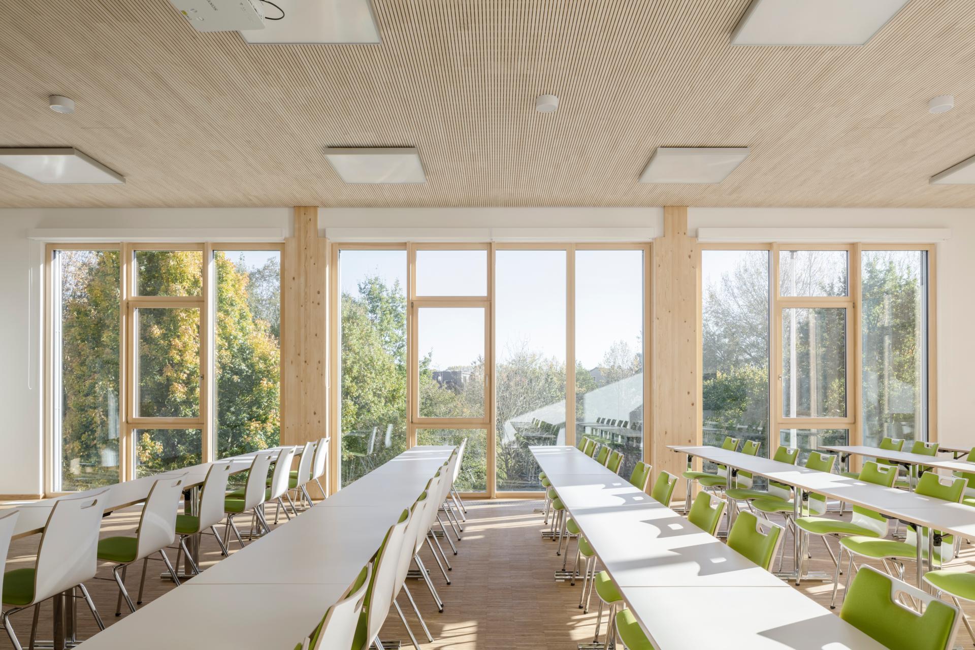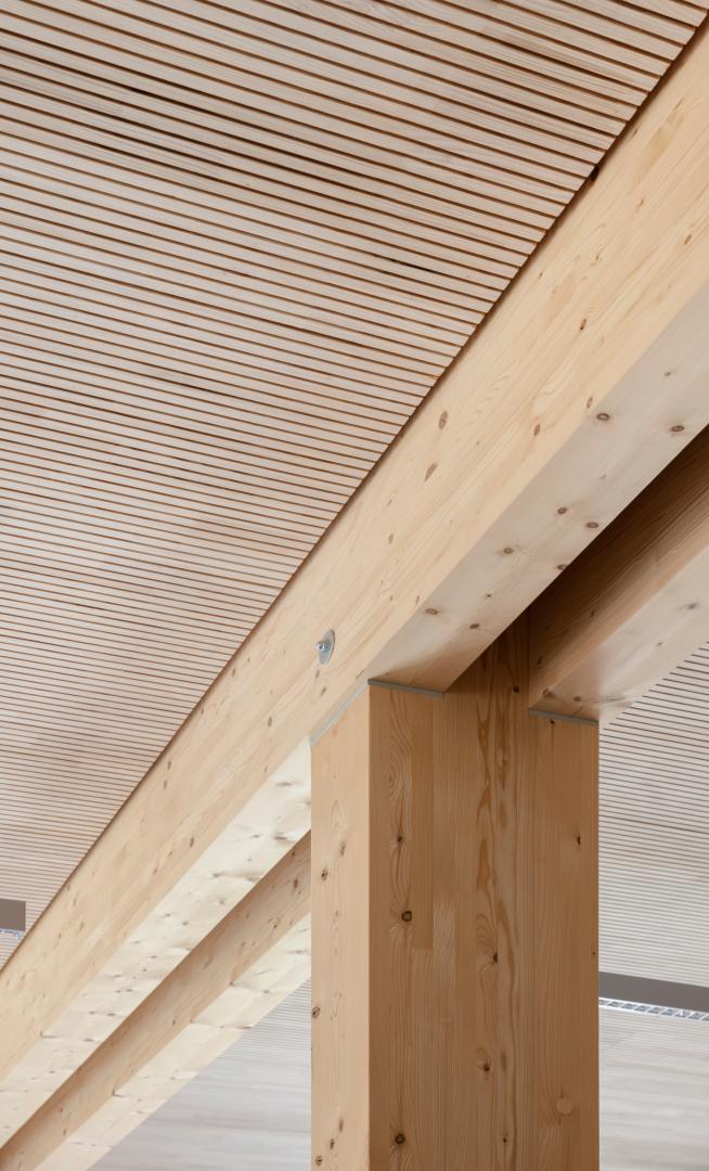 The structural system works in unison with timber as main material and is both simple and functional. The structural elements of columns, beams and ceilings feature exposed wood, so that all occupants can experience the timber construction inside. Both structure and building technology are exposed and produce an original aesthetics. Wood as a material creates a sense of identity, for its sensitive surface gives every visitor an immediate understanding through appearance, feel, and smell.