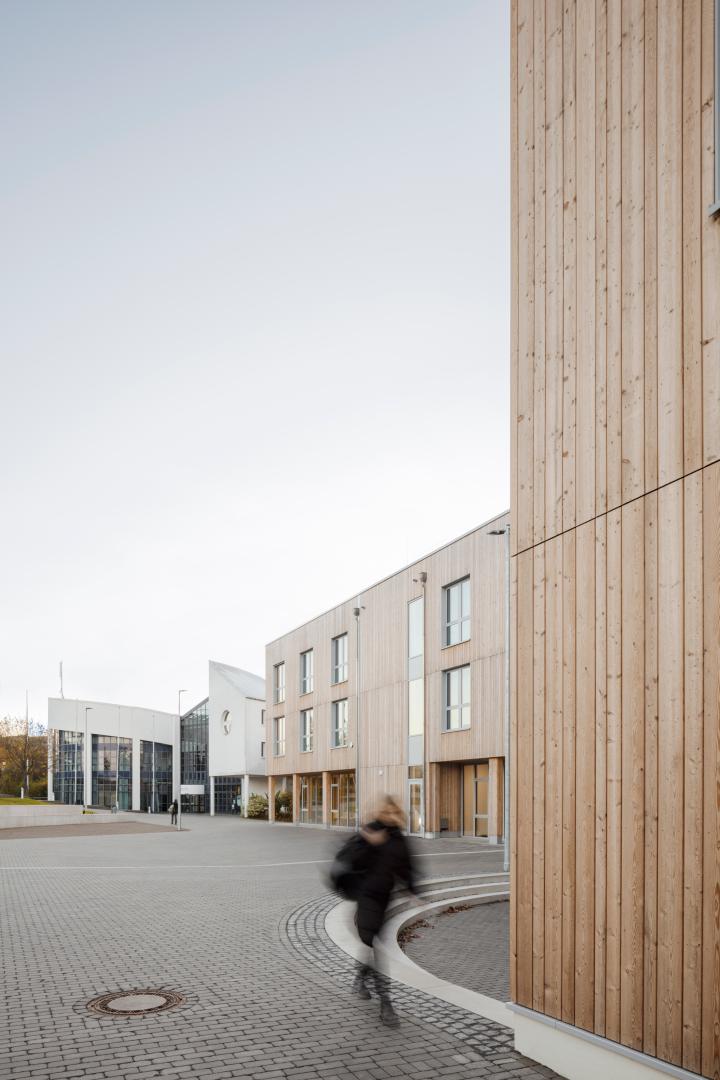 The ”Zukunftsraum” is wrapped in a curtain of natural larch wood. Wood as a soft, organic material is a new addition to the campus, expanding a wide range of already existing materials with its sustainable features.
