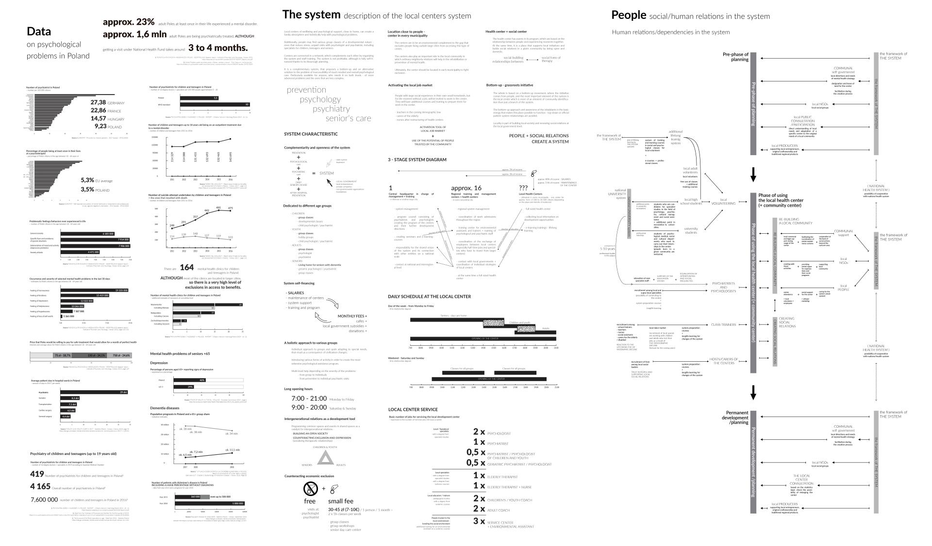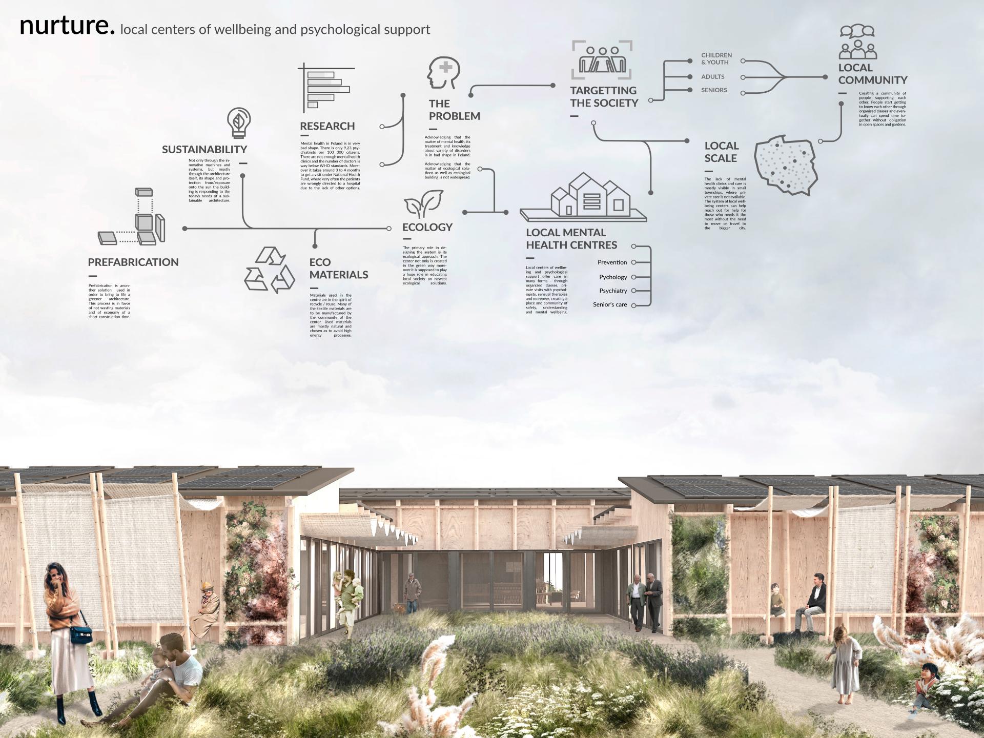 NURTURE is a project of a comprehensive system of prefabricated ecological centers, offering economically available psychological help and support in local communities in Poland. It is a response to the global post-pandemic problem of depression as well as very difficult access to this type of help in Poland. The design of the centers is not only a building but a complete socio-economical system, based on sociological research. The center is easily expanded to changing social needs through its modular construction - thanks to this, it remains sensitive to sudden and large-scale social changes, e.g. the current refugee crisis related to the war in Ukraine.
