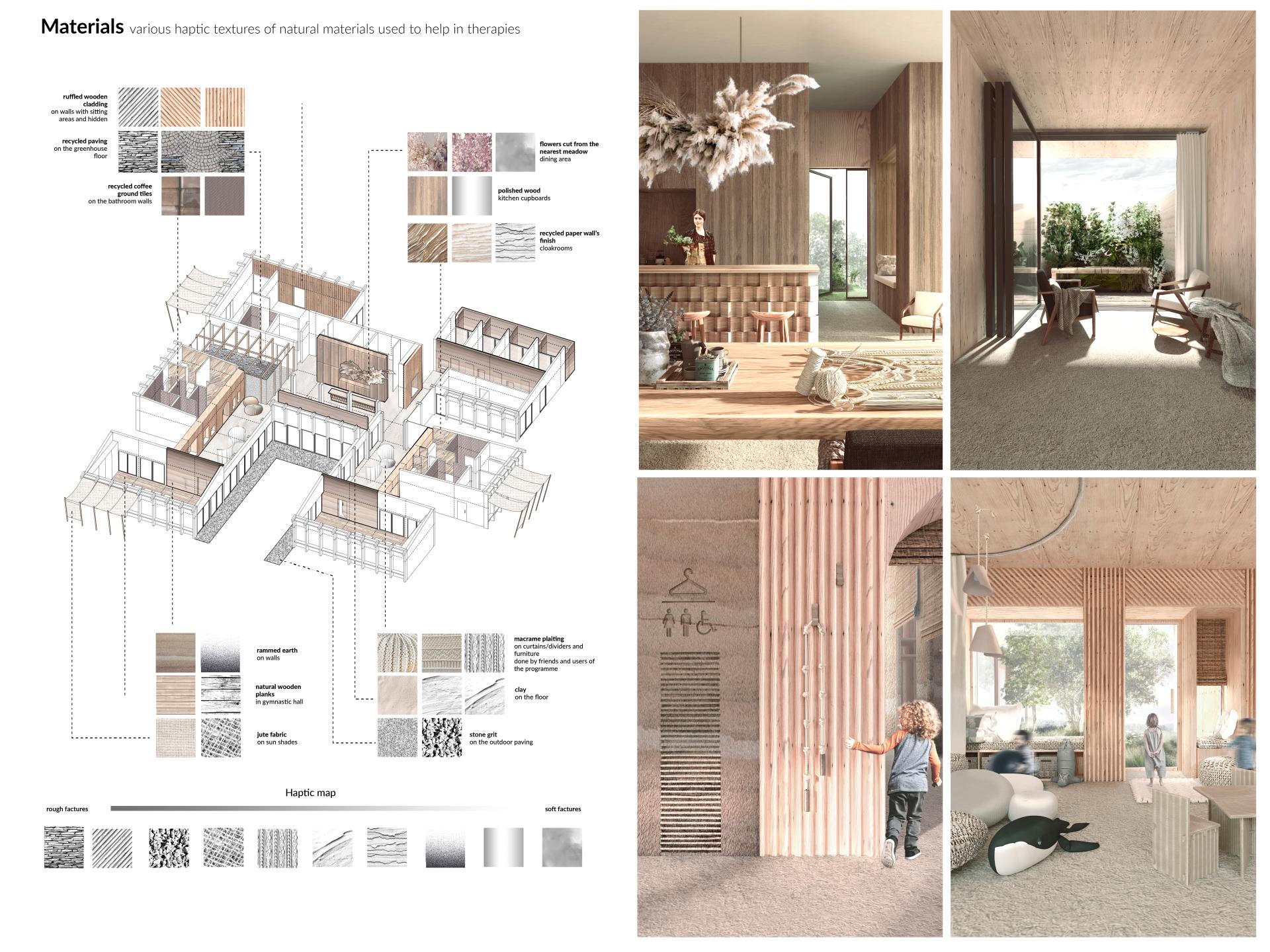 - Additionally, each of the design features and materials of the interior serves as a therapeutic aspect, since the use of varied textures and juxtaposition of the pieces elicits the effects of healthcare on three separate levels: the haptic, acoustic and visual.