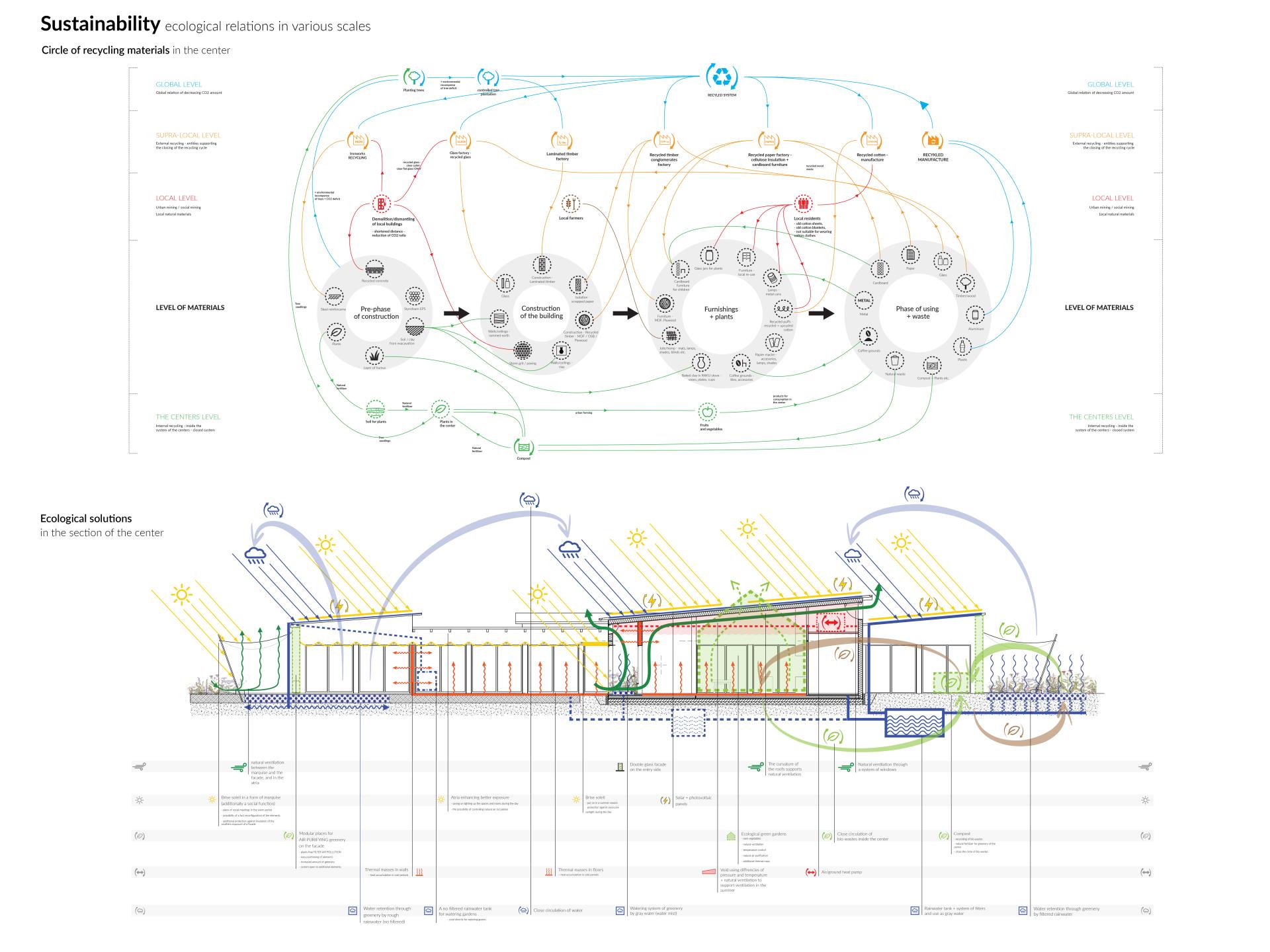 The center uses economical solutions for the highest ecological efficiency. The centers support various materia circulation schemes in both local and global systems and mutual relation between natural solutions and ecological systems. Largesized prefabrication, low-energy recycling or upcyling are part of the strategy of reducing waste of building materials and reducing CO2 balance. An important element of the material chain is urban mining and upcycling of natural materials obtained jointly among and by the local community.