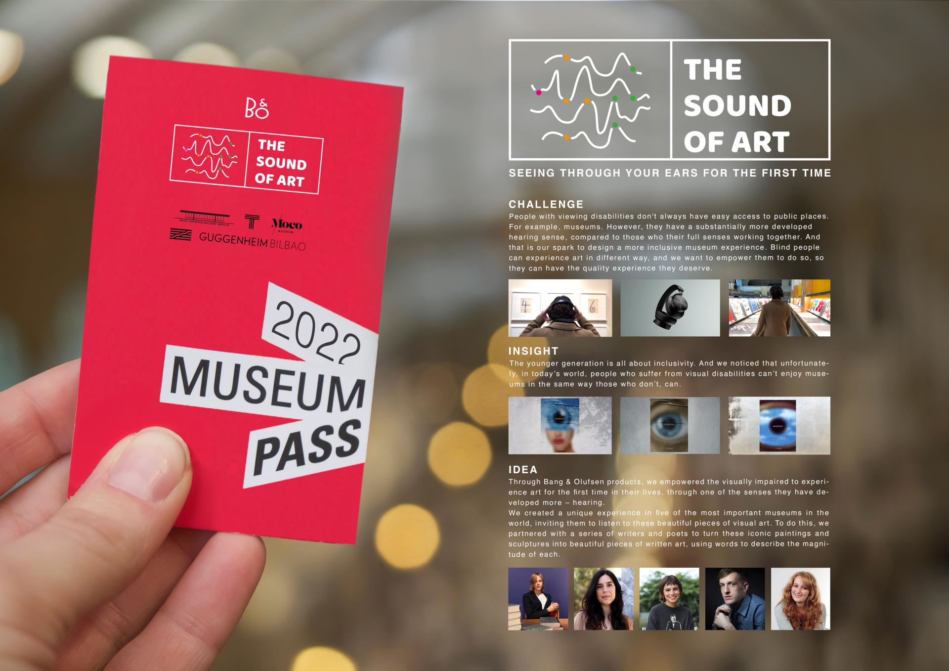 We created a unique experience in five of the most important museums in the world, Triennale in Milan, Tate Modern in London, Guggenheim in Bilbao, Centre Pompidou in Paris, MoCo museum in Amsterdam and Hamburger Bahnhof in Berlin; inviting all kind of people to listen to these beautiful pieces of visual art from another perspective. To do this, and to reach a younger target so that the theme of inclusion could be spread, we partnered with a series of writers and poets, all aged less than 35, from all Europe, to turn these iconic paintings and sculptures into beautiful pieces of written art, using words to describe the magnitude of each.
