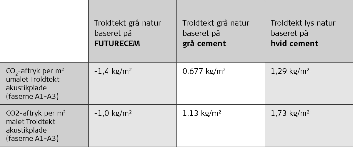 - Unpainted Troldtekt acoustic panels based on FUTURECEM have a carbon footprint of -1.4 kg per m2