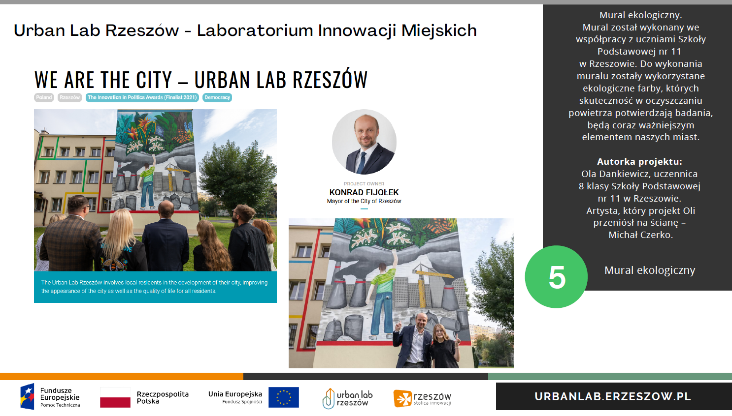 The key goal of the project was to encourage and engage residents to submit ideas as part of the competition, where the residents together with the City refined their ideas and thus could participate in them as the authors of the project. For example, a mural is a concept that was developed as part of a school competition by a student of the 6th grade of a primary school from Rzeszow. The children's idea was produced and the artists from Rzeszow placed it on the main wall of the school. The involvement of children and the selection of the project for implementation was an invitation to the youngest residents to co-create the so-called Cities for children, where children create space with adults and their voice is important. Rzeszow's approach to giving the city area to children and the possibility of creating common spaces presents equal opportunities to participate in the development of everyone interested in its development.