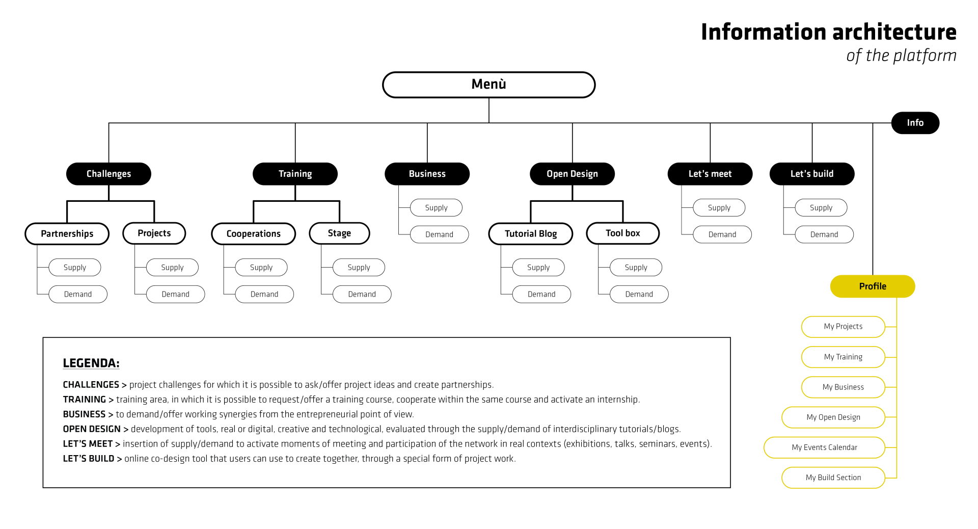 The platform will allow interaction and co-design on: project challenges, project ideas, and partnerships; interdisciplinary training paths and research projects; new business systems; technological, digital, and creative tools still experimental; events and moments of participatory meeting.