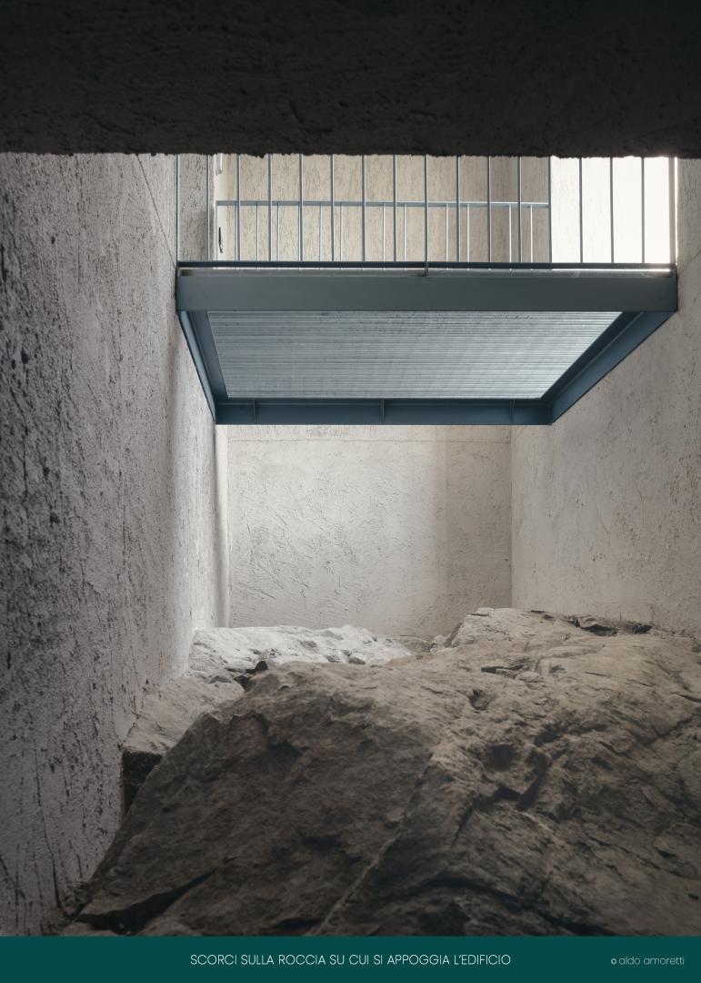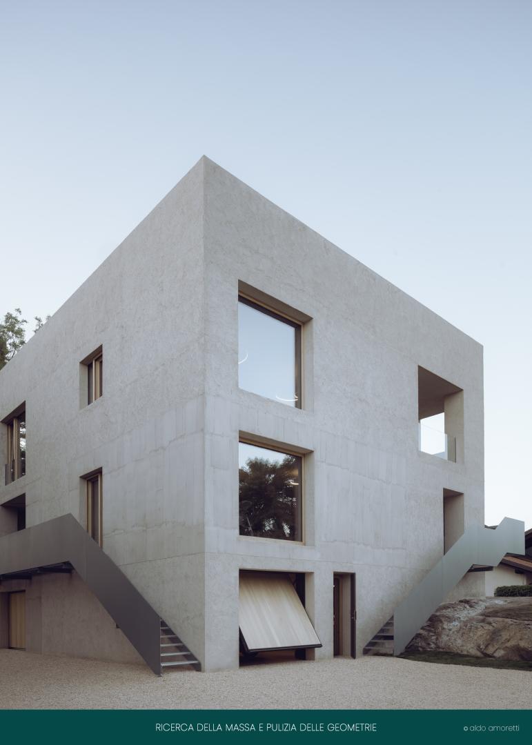 I lavori consistono in interventi di efficientamento energetico, rinnovamento strutturale, oltre al totale restyling di un edificio residenziale degli anni Sessanta, frazionabile in tre appartamenti indipendenti. , semplificandone la geometria, ridisegnando pieni e vuoti con grandi fori squadrati e trasformando la copertura in una superficie utile e riservata. La massiccia presenza dell'edificio, dovuta al rinforzo strutturale e all'isolamento a risparmio energetico, gli conferisce un aspetto da fortezza, ulteriormente esaltato dalle finiture grezze delle pareti interne in continuità con l'esterno. Il suo severo rapporto con il suolo è enfatizzato da una grande roccia, su cui sorge l'edificio, e un gioco di vuoti e doppie altezze sul lato sud rende la roccia visibile da tutti i piani. L'atmosfera severa creata dalle linee rette è addolcita da arredi su misura, porte e finestre in legno, oltre a ampie vedute sul verde bosco e tagli di luce che intercettano i diversi livelli dell'edificio. Per soddisfare le esigenze di flessibilità imposte dalla dinamica società odierna, l'edificio può essere suddiviso in tre unità: tre appartamenti, tre ingressi, tre trame di finitura in facciata. Tutti gli appartamenti sono collegati tramite l'ascensore e il vano scala interno, mentre le scale metalliche esterne rendono gli appartamenti e il tetto indipendenti e accessibili. porte e finestre in legno, oltre ad ampi scorci sul verde bosco e tagli di luce che intercettano i diversi livelli dell'edificio. Per soddisfare le esigenze di flessibilità imposte dalla dinamica società odierna, l'edificio può essere suddiviso in tre unità: tre appartamenti, tre ingressi, tre trame di finitura in facciata. Tutti gli appartamenti sono collegati tramite l'ascensore e il vano scala interno, mentre le scale metalliche esterne rendono gli appartamenti e il tetto indipendenti e accessibili. porte e finestre in legno, oltre ad ampi scorci sul verde bosco e tagli di luce che intercettano i diversi live