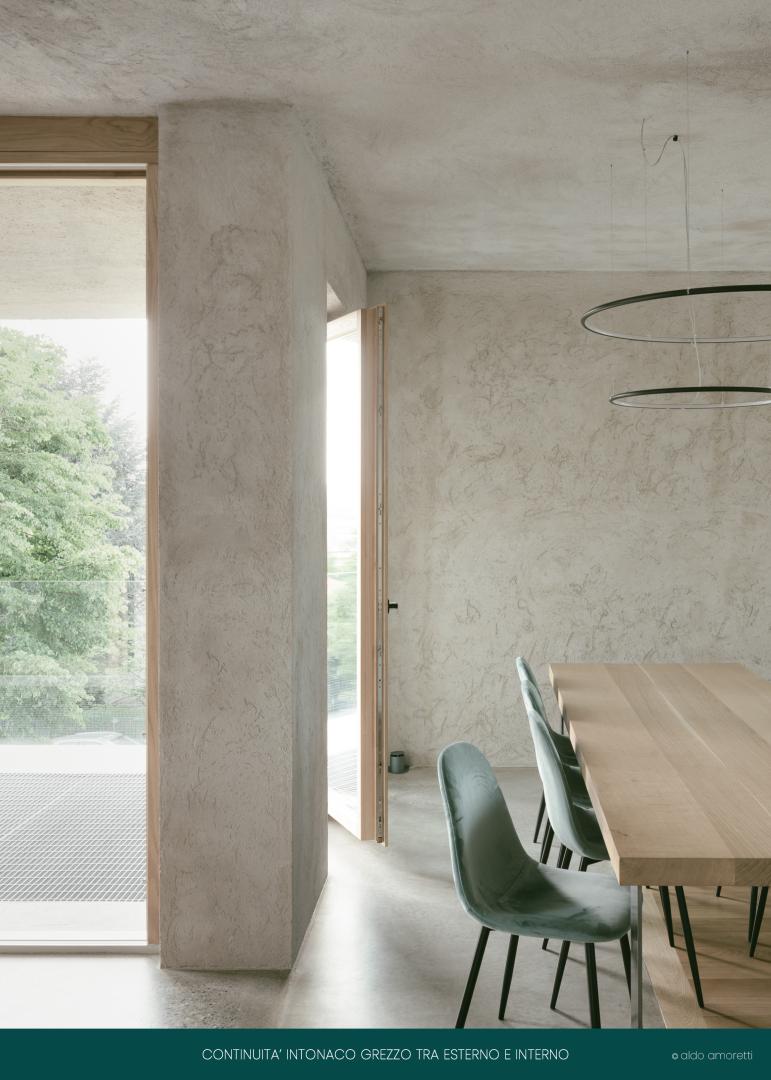 The renovation returns a fluid space, continuous and extensively remodeled over time according to the needs of the inhabitants (insert part on a rotating wall). While the raw and warm materials accentuate the feeling of refuge, the great views of the outside frame and welcome the outdoor garden and panoramic views. Natural light filters through double and triple height holes and touches the rough surfaces of the concrete and natural lime mortar plaster. In the internal environment, the space plays, in fact, on the subtle collision of the relationship-meditation binomial. The project tells an idea of sober living and sensitive to the perception of natural elements: light, air, contact with greenery, perception of materiality.