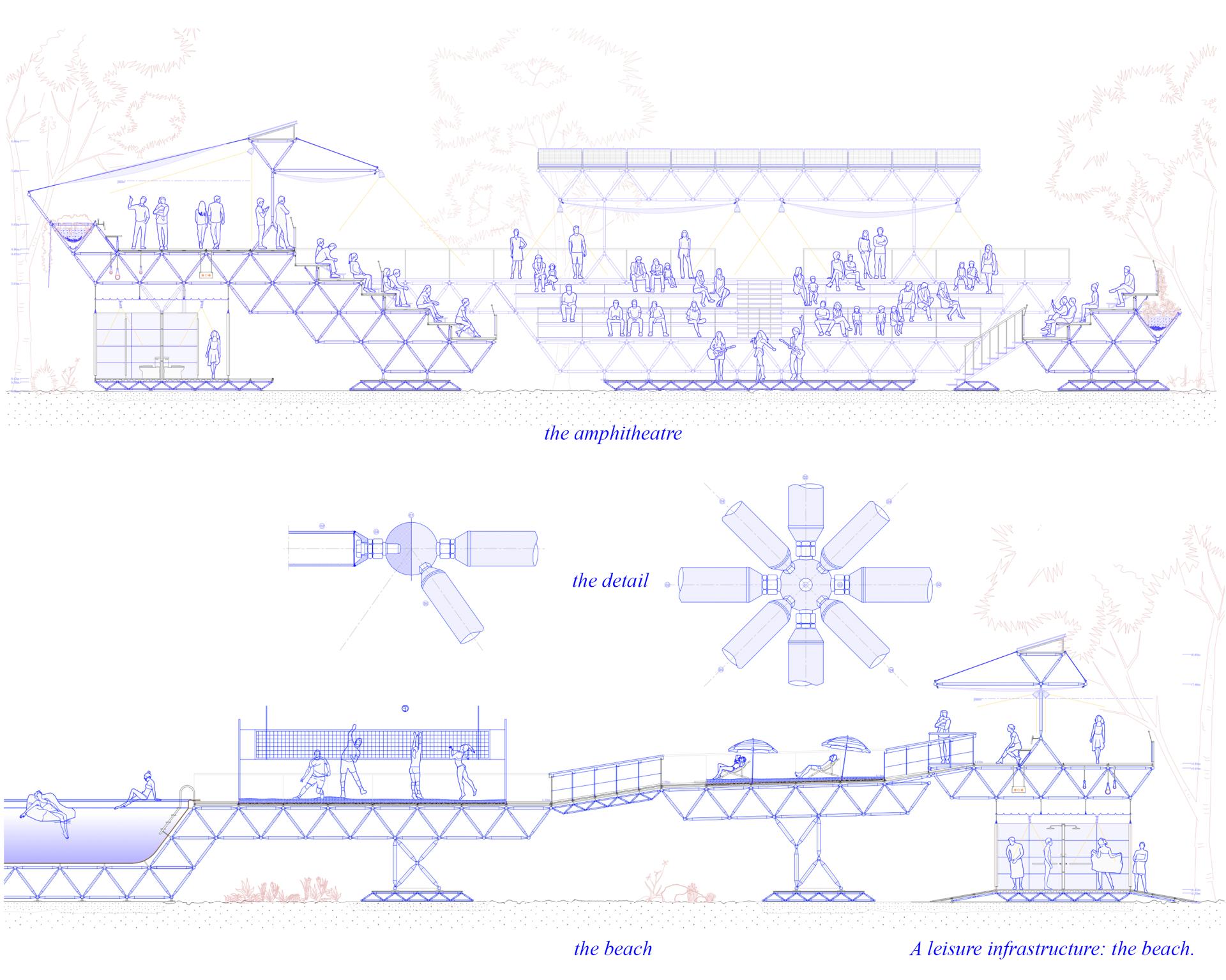 The aesthetic criteria that have been followed are aimed at finding a structure capable of permitting the continuous construction of new leisure spaces and to this end a spatial structure of bars and knots has been used. The use of this type of structure to materialize a protest project is the natural continuation of the utopias proposed throughout the 20th century, which resorted to the assembly of structures that inhabited the air, but without being so ambitious and more aware of the capacities of the place.