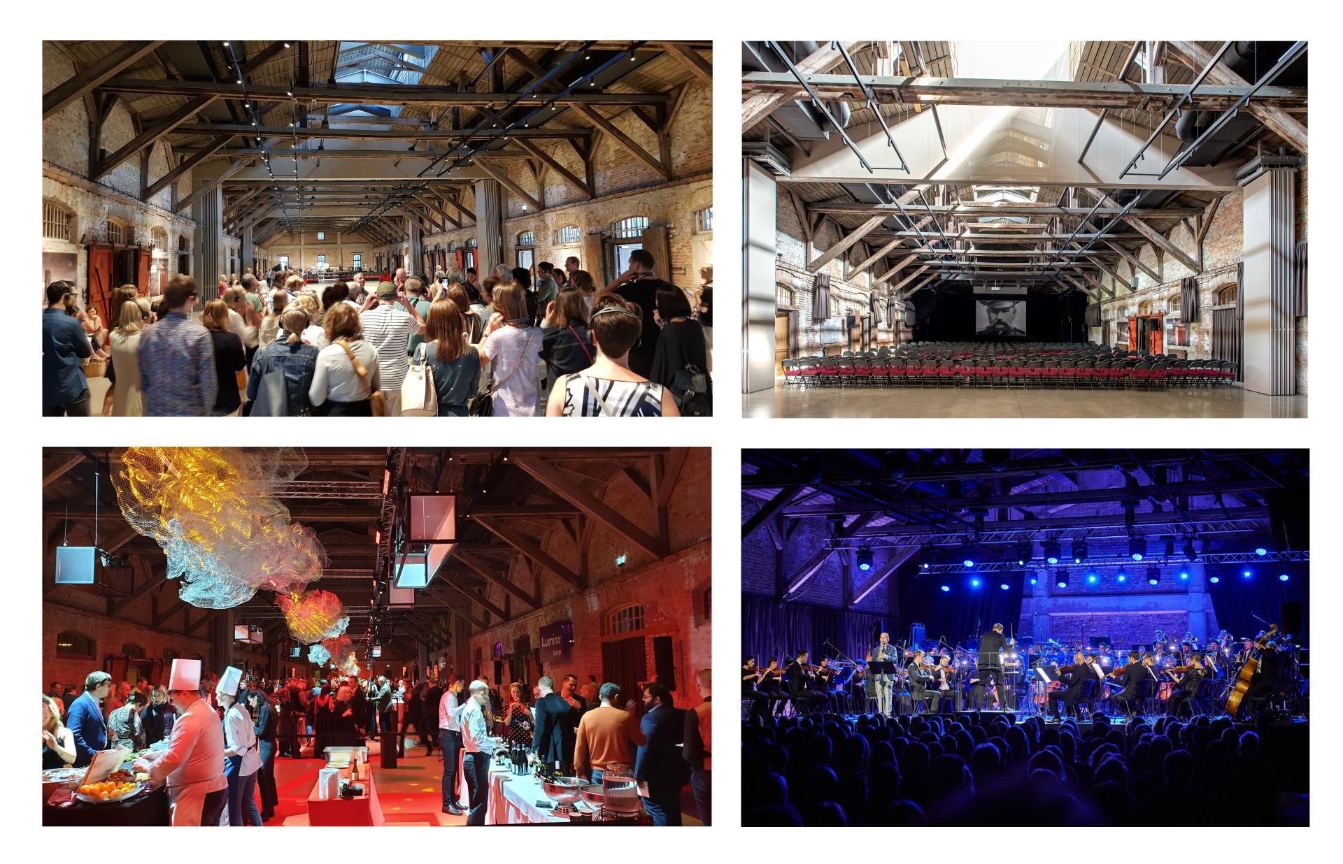 The original warehouse interior is left empty, thus creating a multifunctional event hall (1230 m2). The hall can be divided into three smaller rooms (460m²/310m²/460m²) with the help of acoustic walls. The hall is fitted for 1100 seats or a standing room for 2200 people.