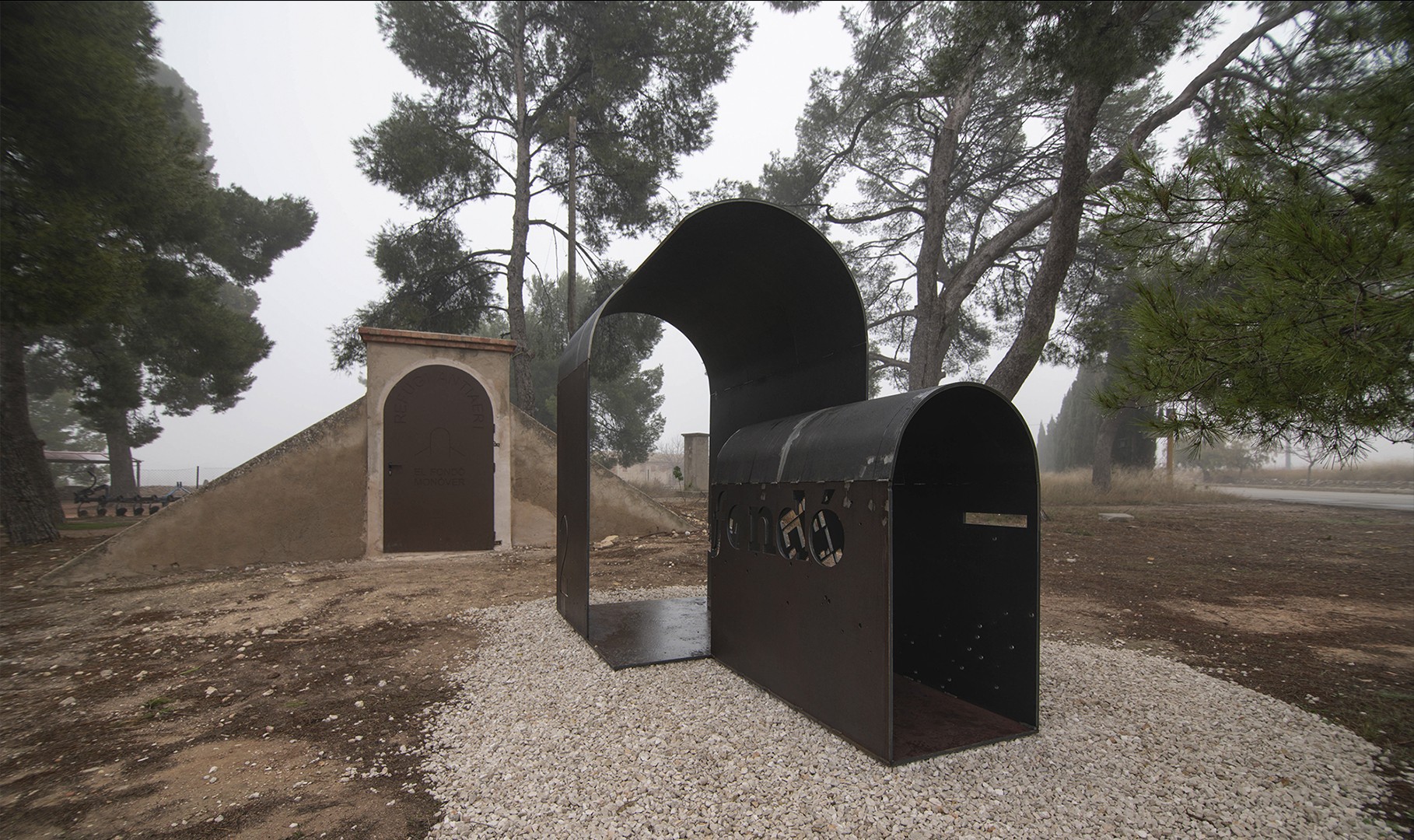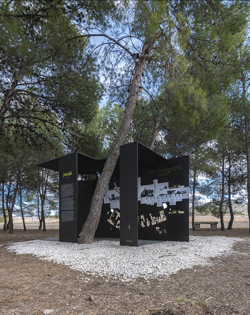Each one of the milestones exposes each one of the four points that make Fondó heritage: airfield (currently non-existent), Station (nowadays a private house), Anti-aircraft shelter (visitable with concerted visit) and the new Interpretation Centre (opened at certain times). These milestones contain a story that have tattooed its walls, accessible, communicative and habitable. In turn, each one, by its physical resilience modify its original geometry into a final architecture rooted into the place, modifying the topography, structural geometry and nearby trees, or even adopting the same profile in its covers than the wings of the last plane which took off from its airfield.