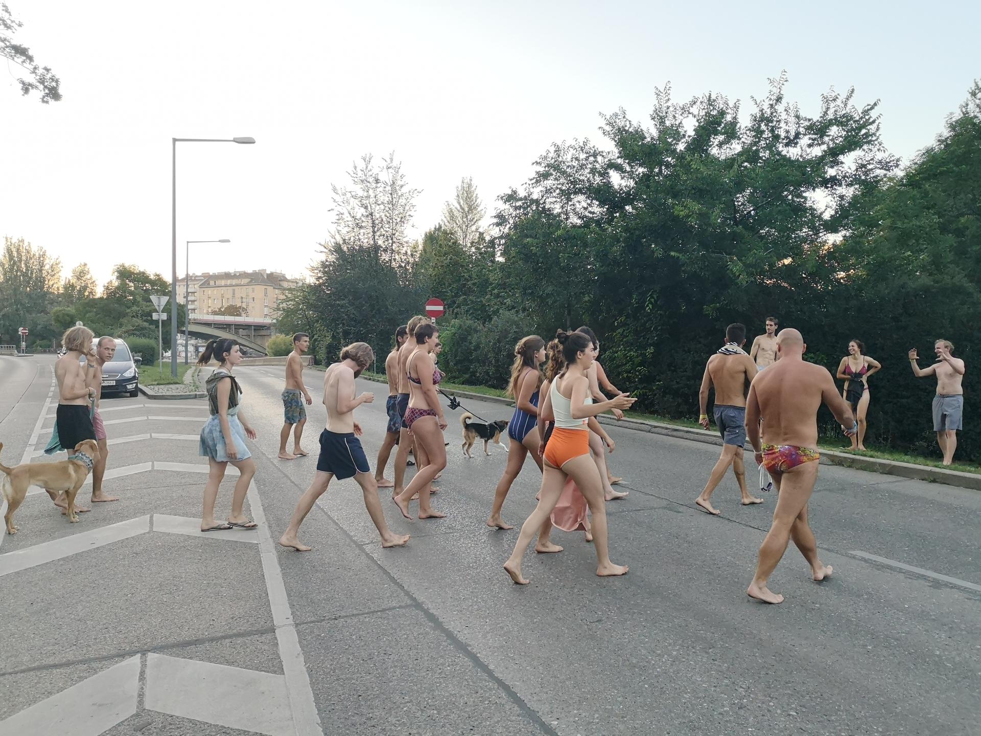 Passerby watch swimmers emerge out of Donaukanal, their drenched swimwear and wet bodies and through this gaze, discover the obvious yet uncommon way of enjoying the site - swimming the site.