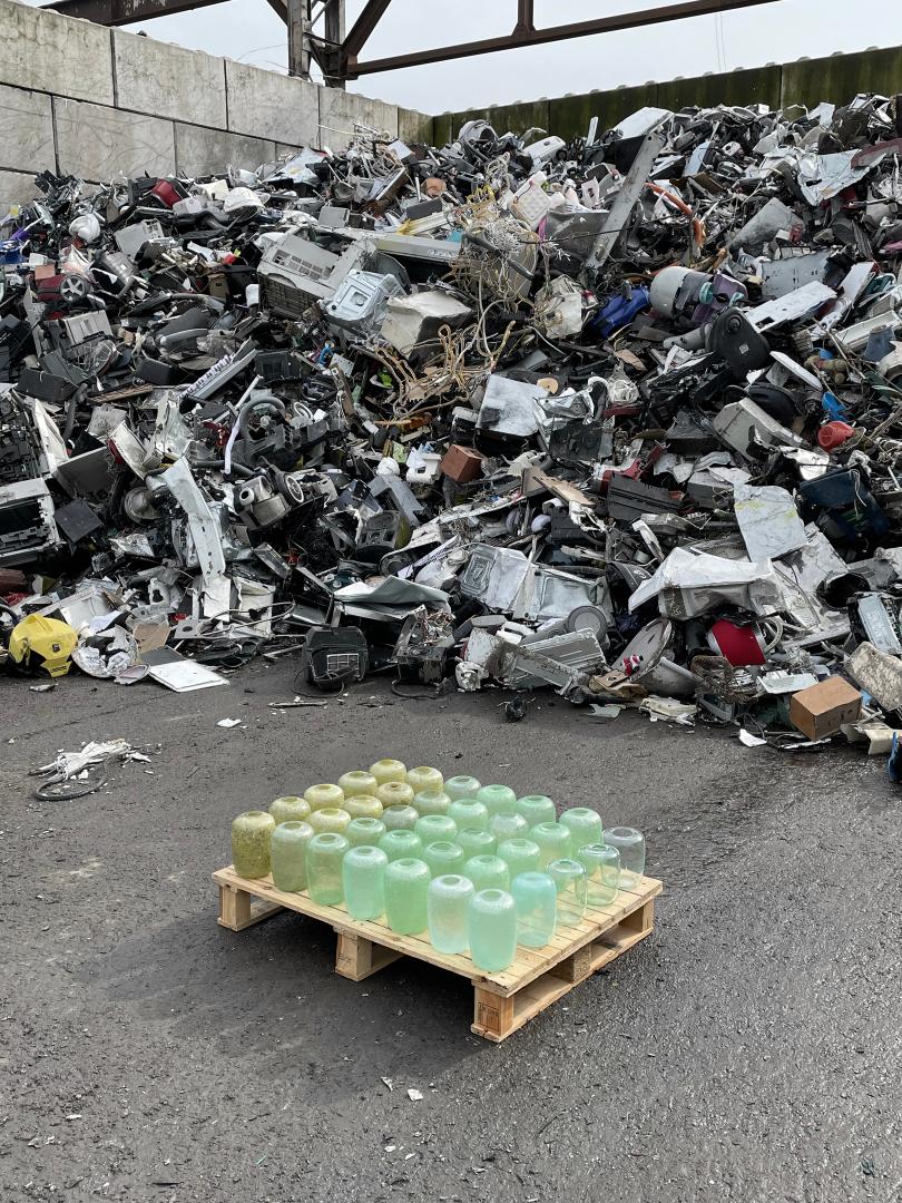 E-waste glass is currently not recycled, despite the very good recycling qualities of glass. Standard industrial glass production, no matter what application context, generates perfectly homogenous glass that is either transparent or coloured. Using E-waste glass heavily interferes with those standards of production, rendering this glass stream unusable by the industry of scale.