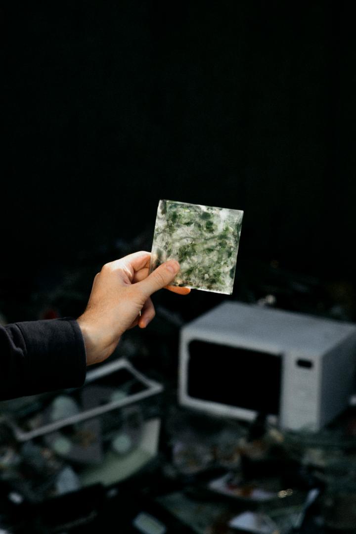 The tiles use the e-waste glass components to create a seaweed-like pattern that is very distinctly innovative in the world of tiles. The partial translucency of the tiles add to the novel aesthetic and functional potential of the tiles. Furthermore, the visual depth created to the partial translucency give surfaces tiled with the tiles a unique visual depth through play with light and reflections.
